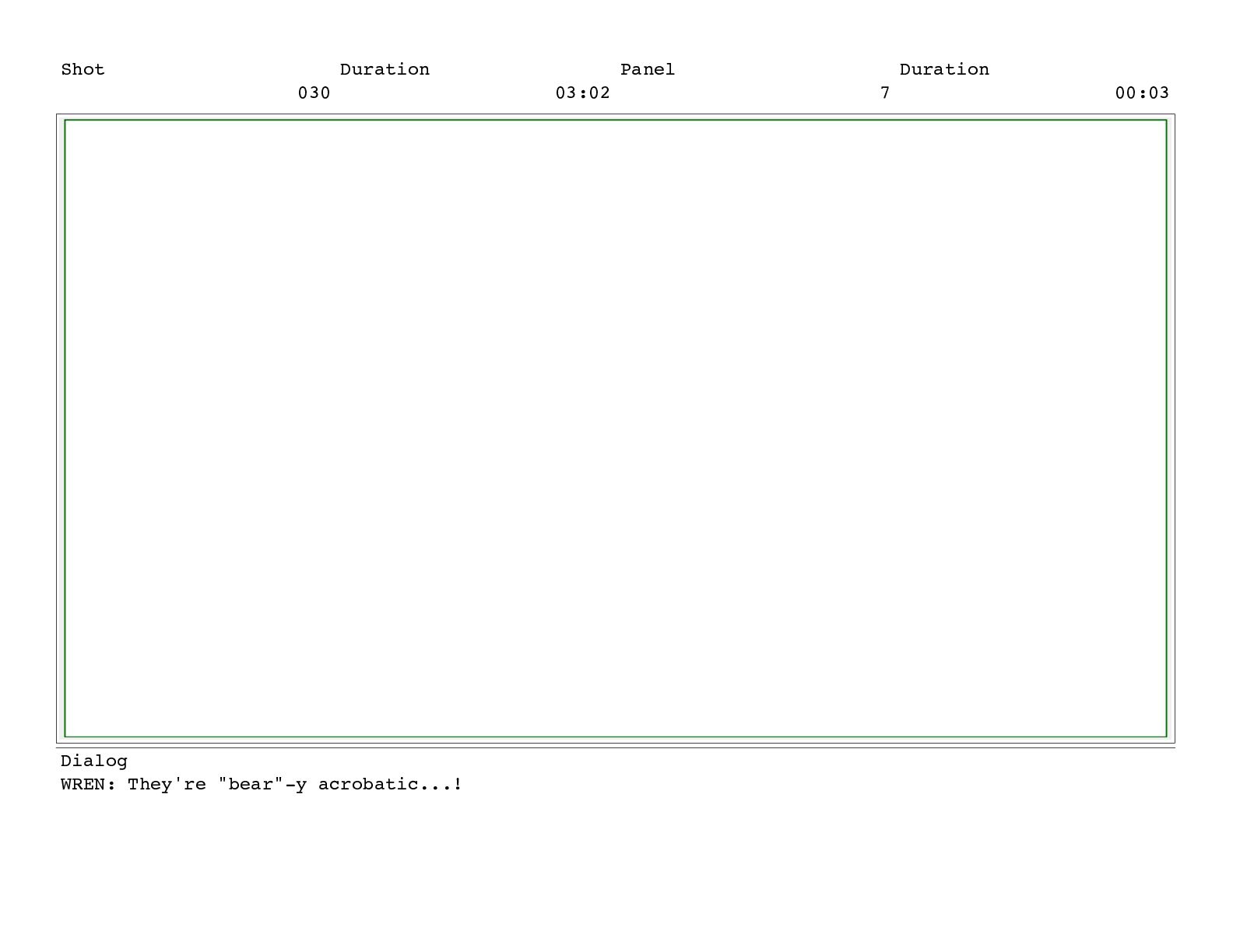 Shot 030 Duration 03:02 Panel 10 Duration 00:10 Dialog WREN: