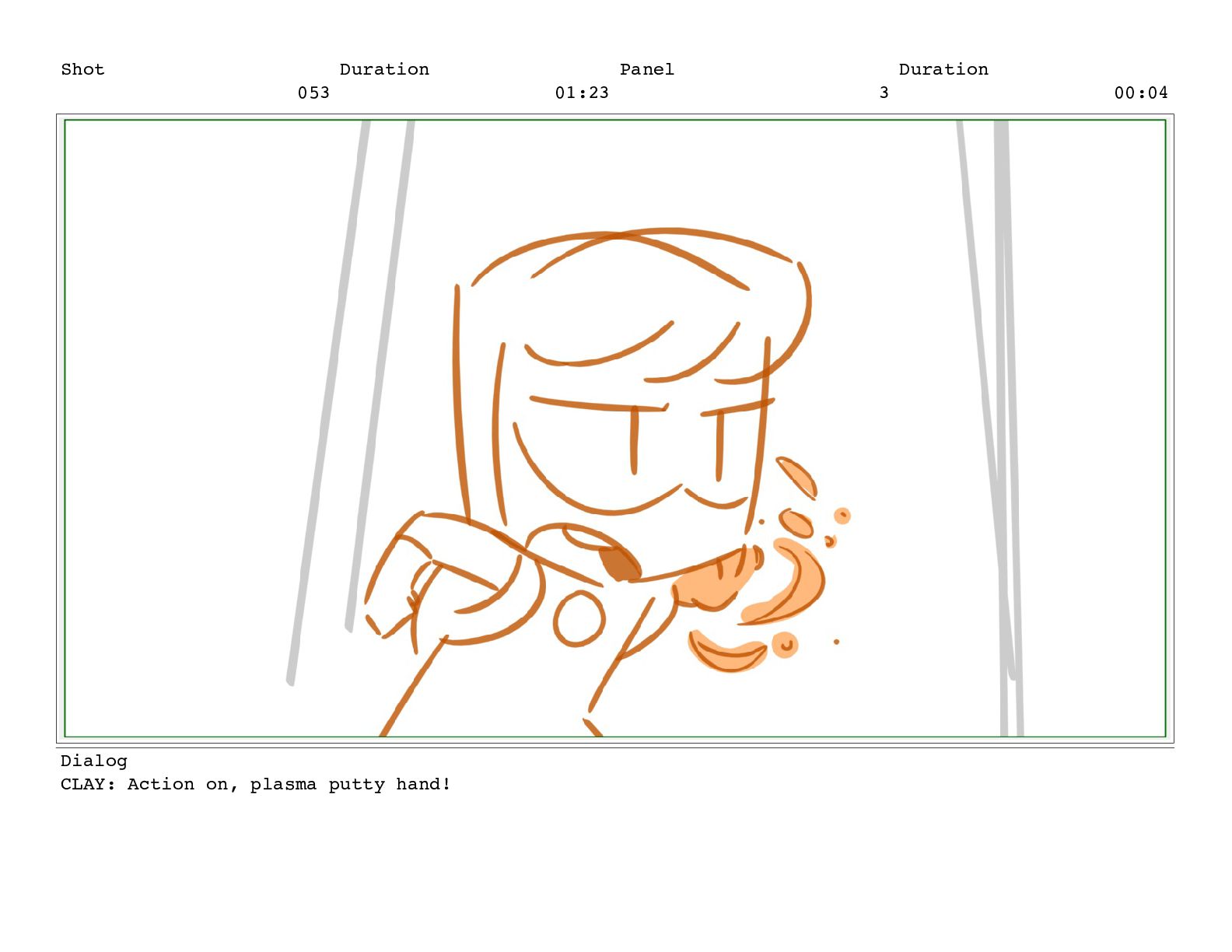 Shot 053 Duration 01:23 Panel 3 Duration 00:04 Dialog CLAY: