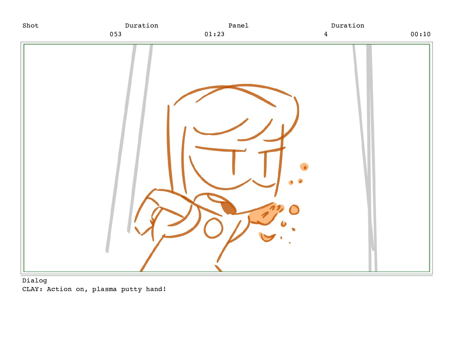 Shot 053 Duration 01:23 Panel 4 Duration 00:10 Dialog CLAY: