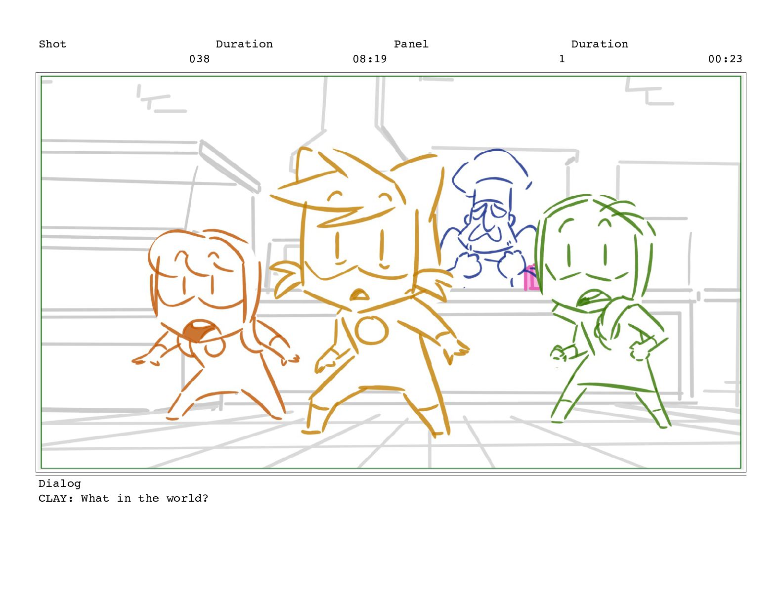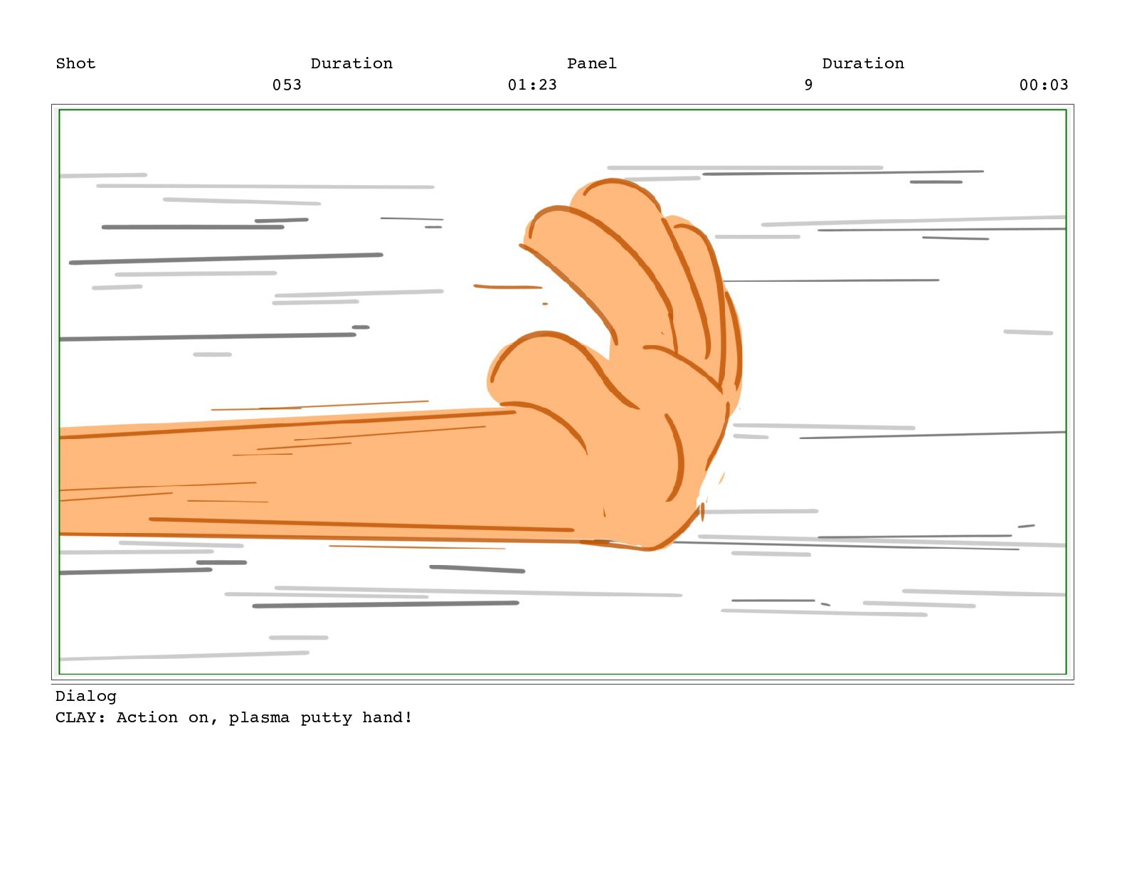 Shot 053 Duration 01:23 Panel 9 Duration 00:03 Dialog CLAY: