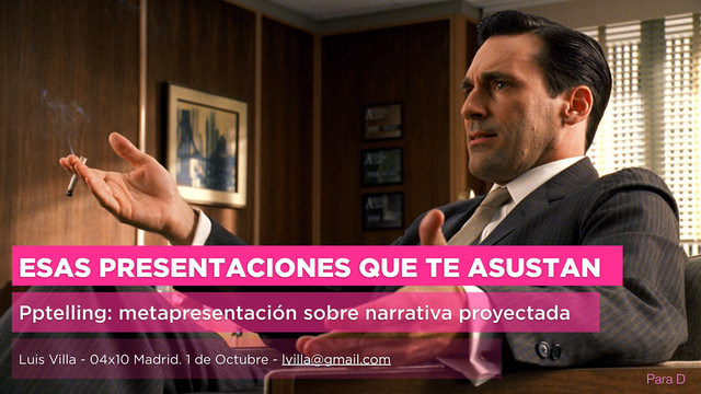 HACER (JUNTOS) CÓMO LO VAMOS A HACER METODOS PLAN REFERENCIAS POR QUÉ ESTAMOS AQUÍ EMOCIONAL Conexión con audiencia Construcción de la relación Resonancia Ruta "transformacional" RACIONAL Técnico, mecánico "Commoditizable" FINAL Conclusiones Deseo Llamada a la acción INTRODUCCIÓN Quienes somos Credenciales Por qué hemos venido Objetivos ¿CUANTO TIEMPO Y DINERO? CIERRE PATHOS LOGOS ETHOS TRANSFORMACIÓN ¿PUEDE REPETIR SUS ÉXITOS PASADOS CONMIGO? ¿QUÉ TENGO QUE HACER? MMM... ESTE TIPO ENTIENDE MI PROBLEMA AHÁ! ¿QUIEN ES ESTE TIPO? ME IMAGINO EN MI NUEVO STATUS ¿SOY CAPAZ DE HACERLO? LO QUIERO! ¿QUÉ HACE AQUÍ? ¿A QUÉ VIENE? CONTINÚA... ¿POR QUÉ DEBO CONFIAR? ¿OTRO CHARLATÁN?