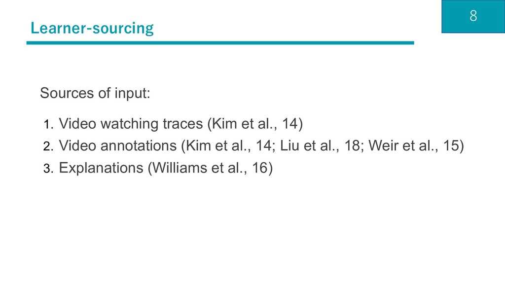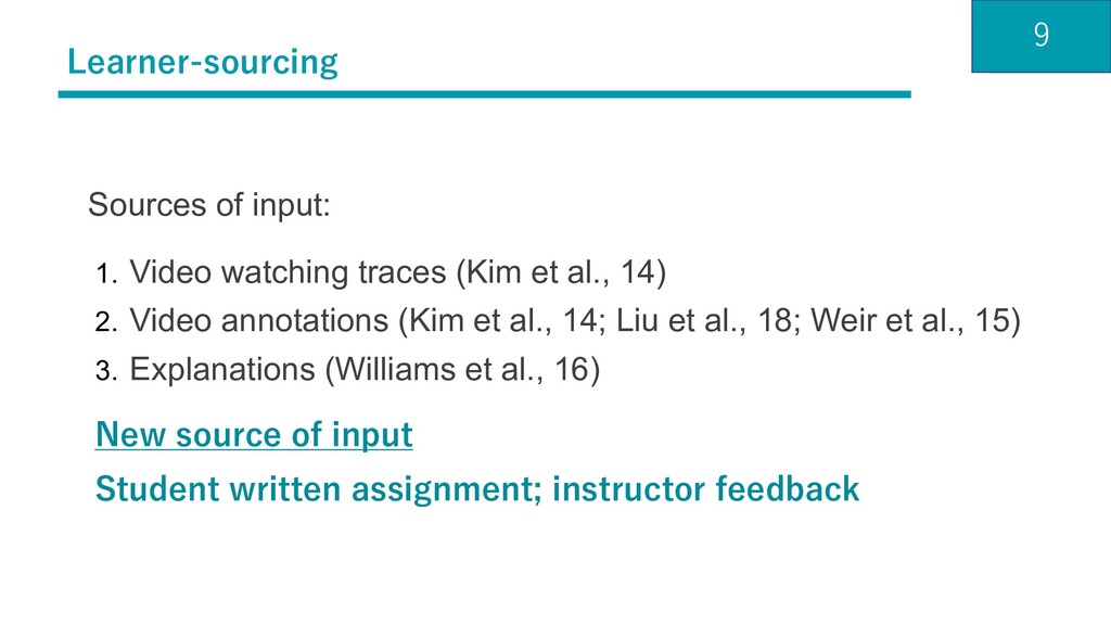 Phu Tran Nguyen, Sarah Weir, Philip J. Guo, Robert C. Miller, and Krzysztof Z. Gajos. 2014b. Crowdsourcing Step-by-step Information Extraction to Enhance Existing How-to Videos. In Proceedings of the 32Nd Annual ACM Conference on Human Factors in Computing Systems (CHI ’14). ACM, New York, NY, USA, 4017–4026. (Kluger et al., 1996) : Avraham N Kluger and Angelo DeNisi. 1996. The effects of feedback interventions on performance: A historical review, a meta-analysis, and a preliminary feedback intervention theory. Psychological bulletin 119, 2 (1996), 254 (Kulkarni et al., TOCHI’13) : Chinmay Kulkarni, Koh Pang Wei, Huy Le, Daniel Chia, Kathryn Papadopoulos, Justin Cheng, Daphne Koller, and Scott R. Klemmer. 2013. Peer and Self Assessment in Massive Online Classes. ACM Trans. Comput.- Hum. Interact. 20, 6, Article 33 (Dec. 2013), 31 pages. (Liu et al., CHI’18) : Ching Liu, Juho Kim, and Hao-Chuan Wang. 2018. ConceptScape: Collaborative Concept Mapping for Video Learning. In Proceedings of the 2018 CHI Conference on Human Factors in Computing Systems (CHI ’18). ACM, New York, NY, USA, Article 387, 12 pages. (Paas et al., ‘03) : Fred Paas, Alexander Renkl, and John Sweller. 2003. Cognitive load theory and instructional design: Recent developments. Educational psychologist 38, 1 (2003), 1–4.