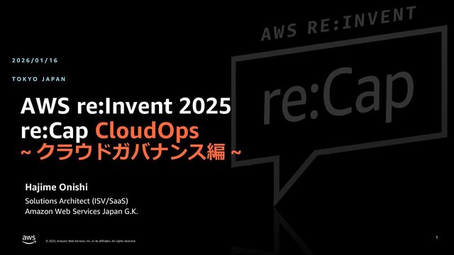 rights reserved. T O K Y O J A P A N AWS re:Invent 2025 re:Cap CloudOps ~ クラウドガバナンス編 ~ Hajime Onishi 2 0 2 6 / 0 1 / 1 6 Solutions Architect (ISV/SaaS) Amazon Web Services Japan G.K. 1