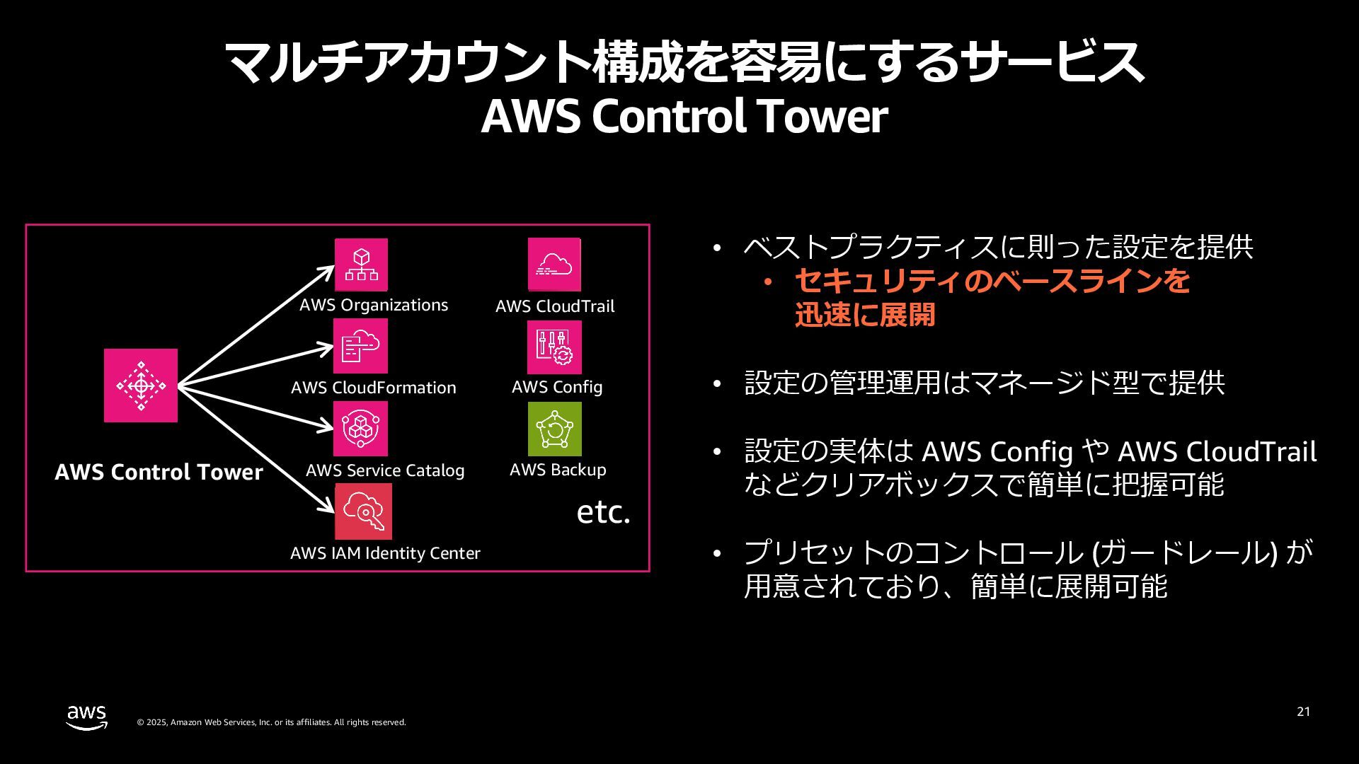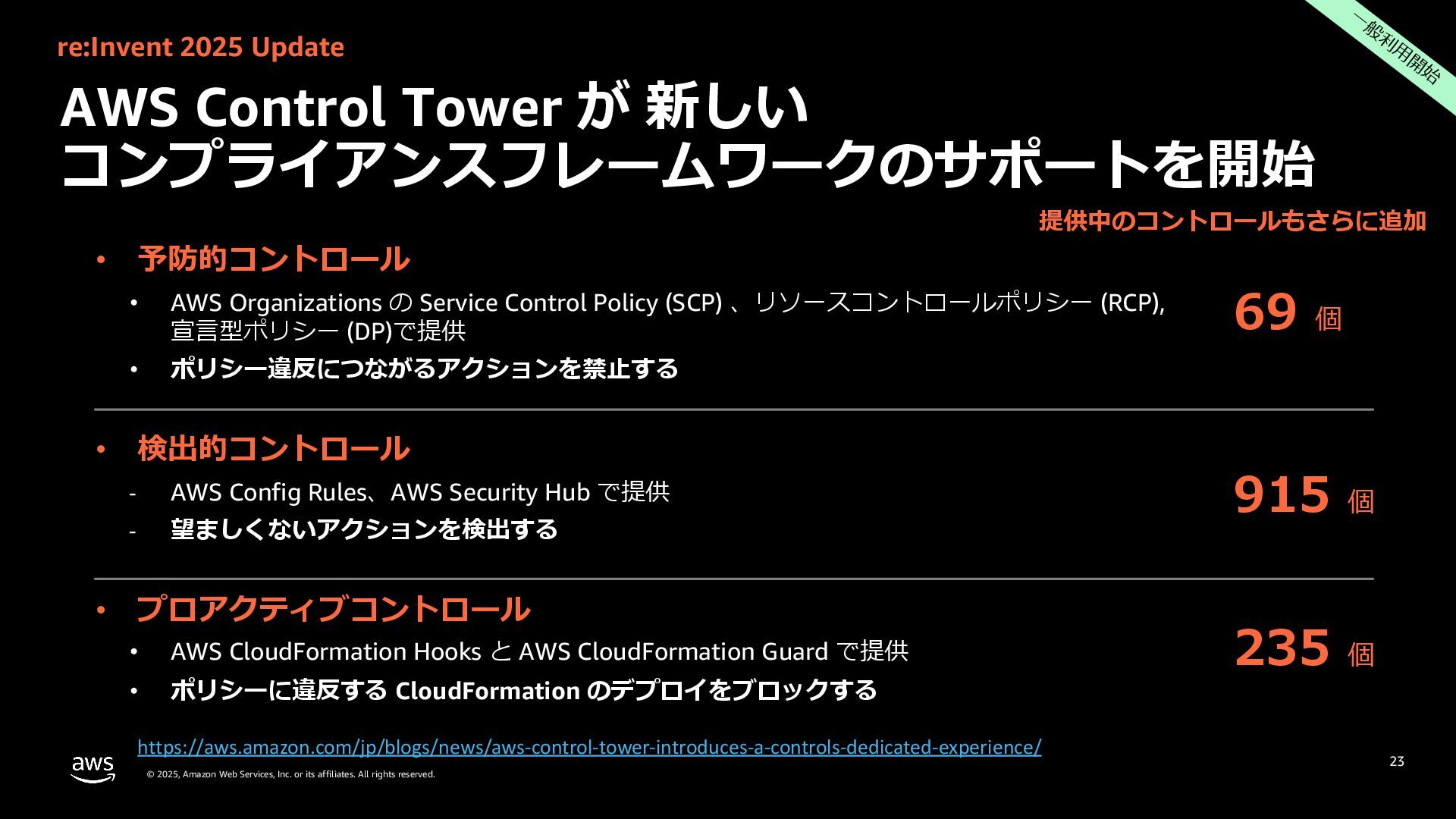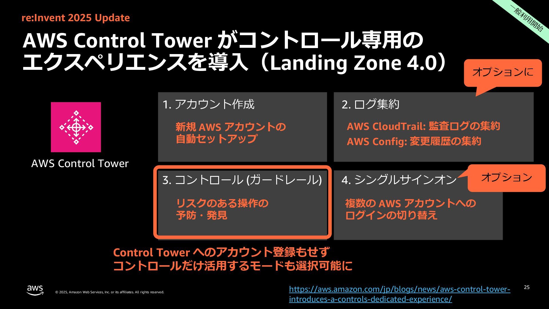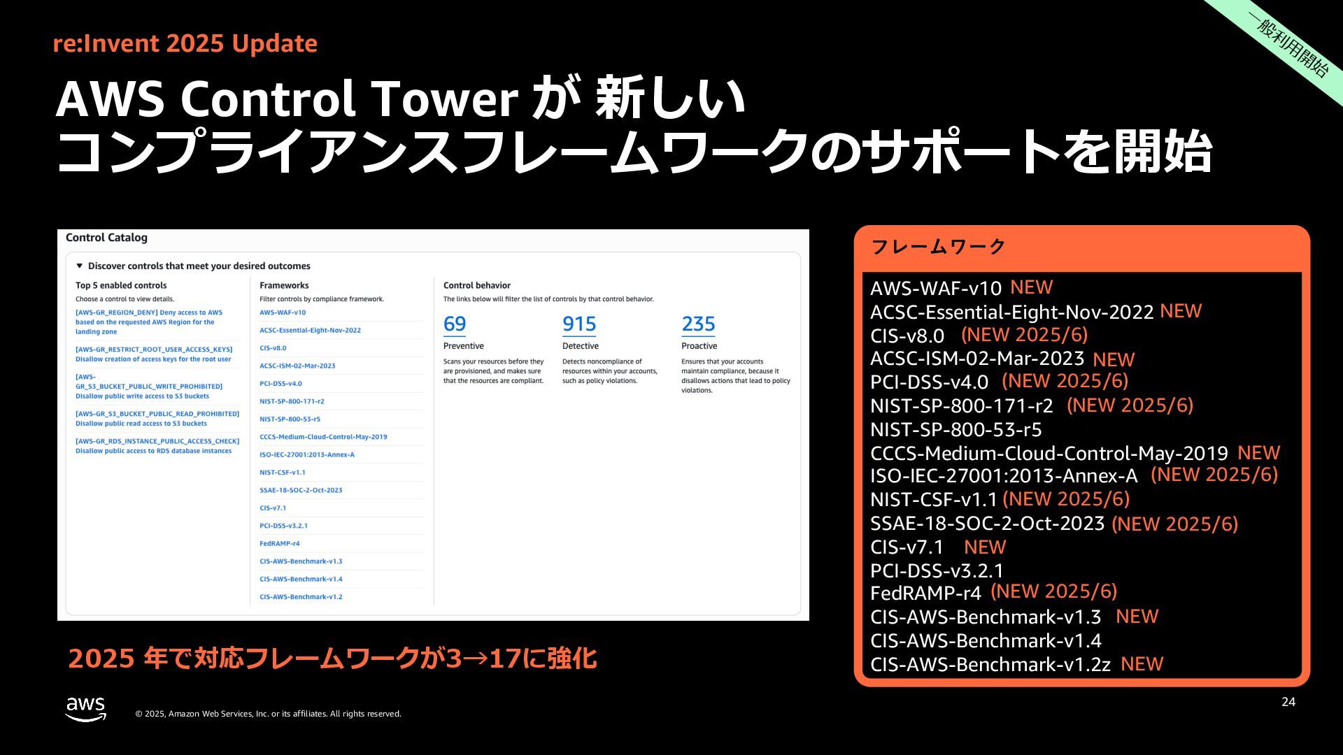 rights reserved. AWS Control Tower が 新しい コンプライアンスフレームワークのサポートを開始 24 ⼀ 般 利 ⽤ 開 始 フレームワーク AWS-WAF-v10 ACSC-Essential-Eight-Nov-2022 CIS-v8.0 ACSC-ISM-02-Mar-2023 PCI-DSS-v4.0 NIST-SP-800-171-r2 NIST-SP-800-53-r5 CCCS-Medium-Cloud-Control-May-2019 ISO-IEC-27001:2013-Annex-A NIST-CSF-v1.1 SSAE-18-SOC-2-Oct-2023 CIS-v7.1 PCI-DSS-v3.2.1 FedRAMP-r4 CIS-AWS-Benchmark-v1.3 CIS-AWS-Benchmark-v1.4 CIS-AWS-Benchmark-v1.2z NEW NEW NEW NEW NEW NEW NEW (NEW 2025/6) (NEW 2025/6) (NEW 2025/6) (NEW 2025/6) (NEW 2025/6) (NEW 2025/6) (NEW 2025/6) 2025 年で対応フレームワークが3→17に強化 re:Invent 2025 Update