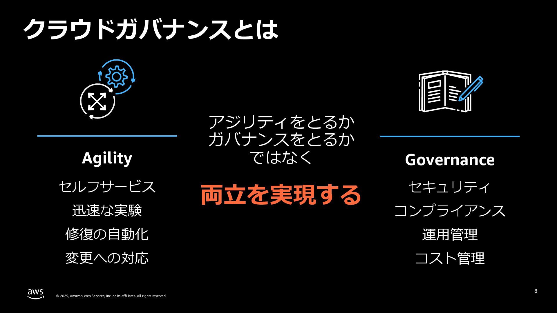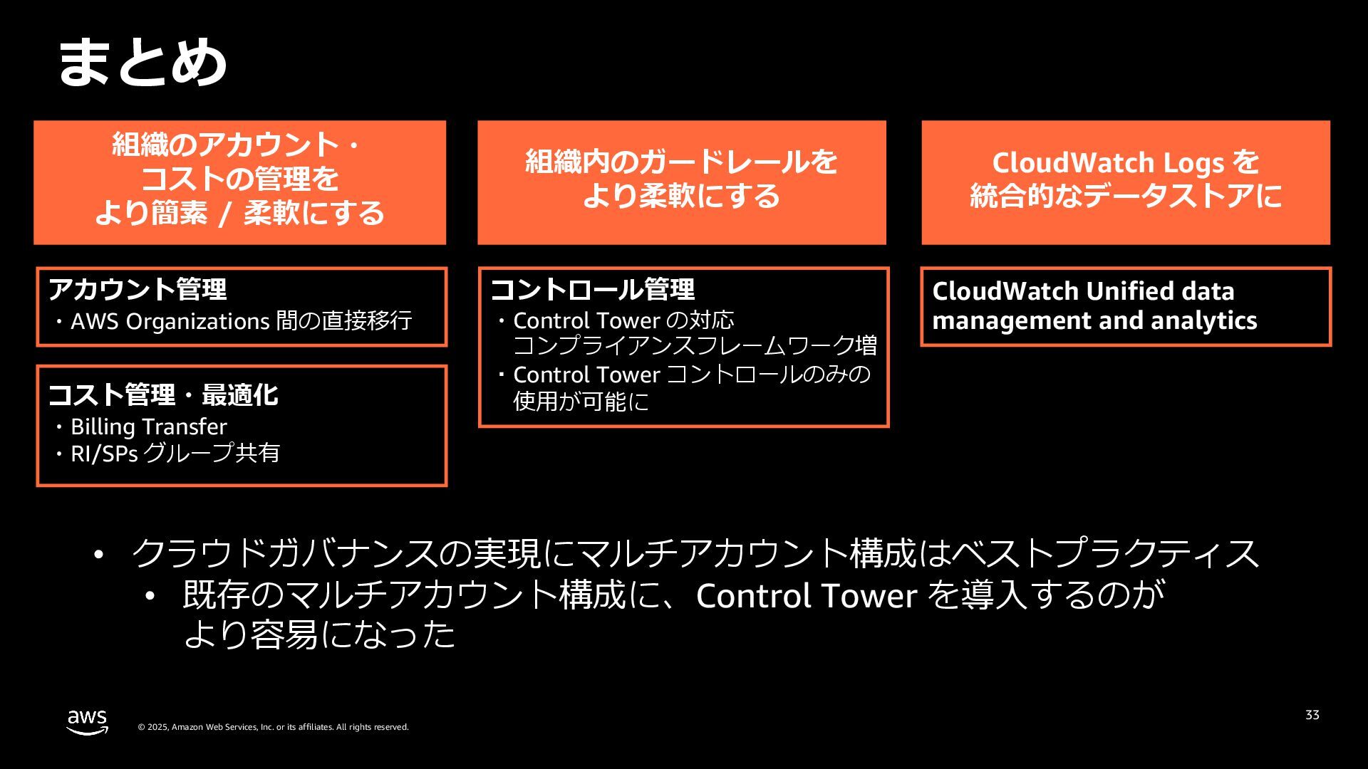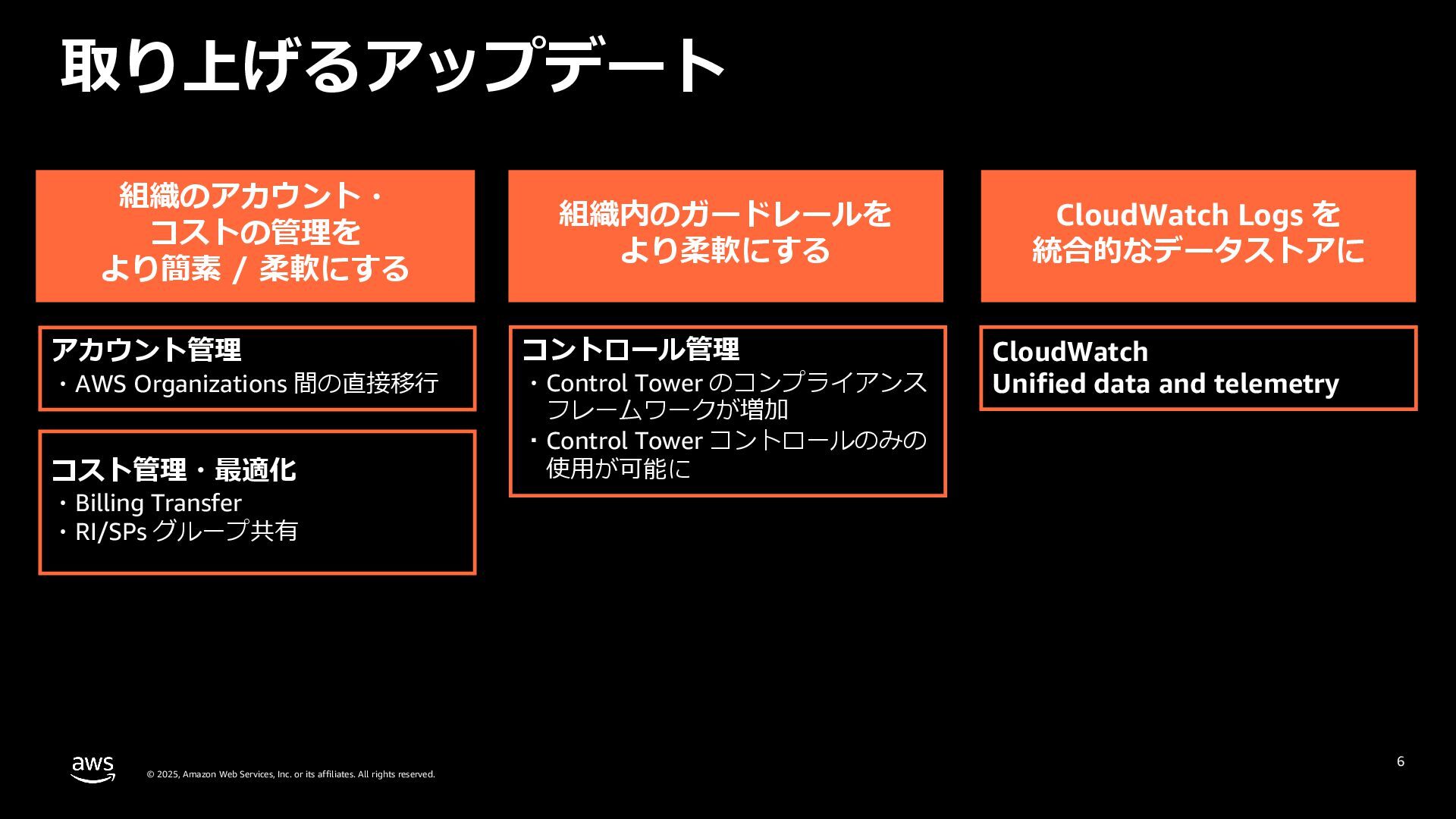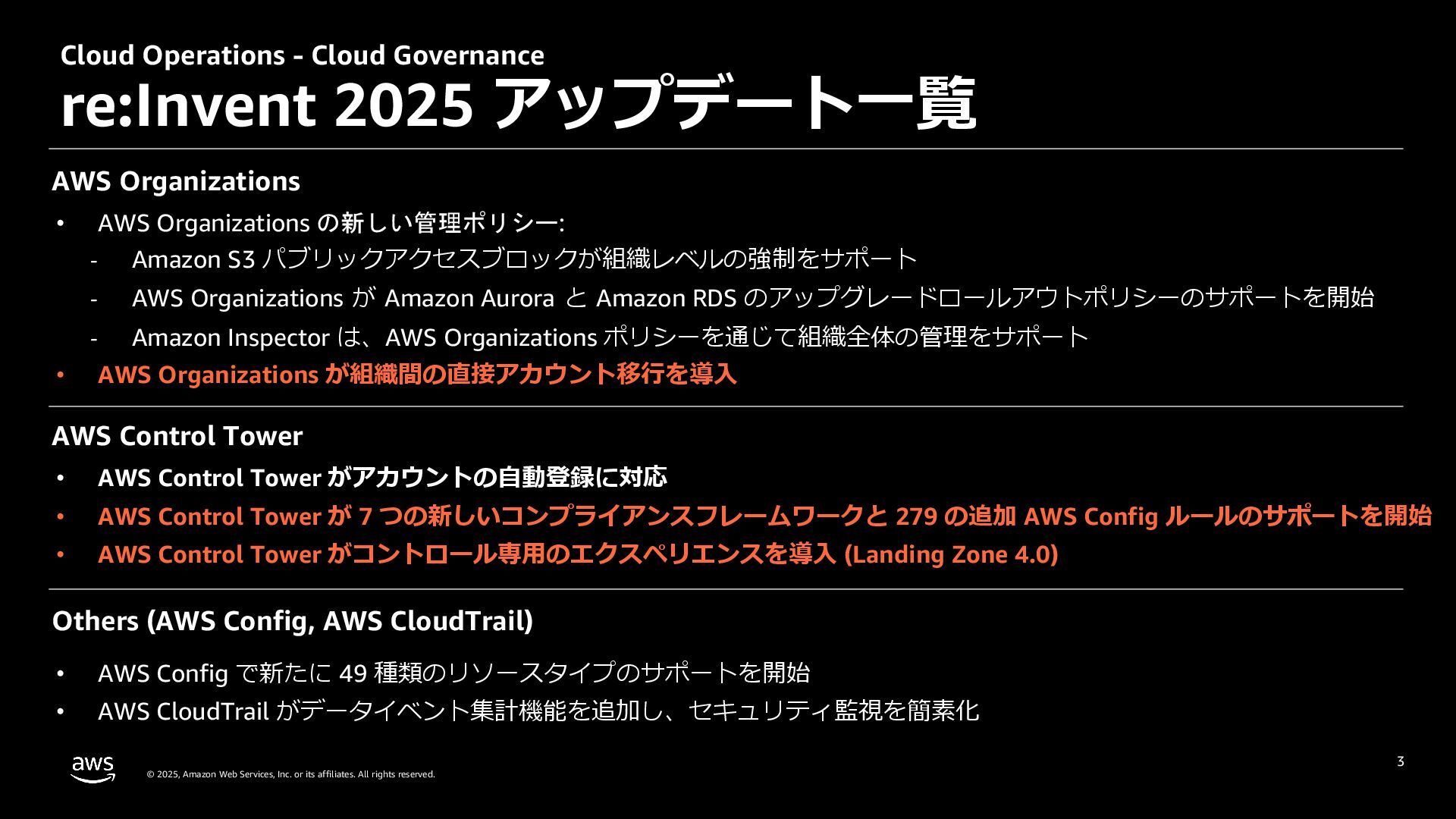 rights reserved. AWS Control Tower が 新しい コンプライアンスフレームワークのサポートを開始 24 ⼀ 般 利 ⽤ 開 始 フレームワーク AWS-WAF-v10 ACSC-Essential-Eight-Nov-2022 CIS-v8.0 ACSC-ISM-02-Mar-2023 PCI-DSS-v4.0 NIST-SP-800-171-r2 NIST-SP-800-53-r5 CCCS-Medium-Cloud-Control-May-2019 ISO-IEC-27001:2013-Annex-A NIST-CSF-v1.1 SSAE-18-SOC-2-Oct-2023 CIS-v7.1 PCI-DSS-v3.2.1 FedRAMP-r4 CIS-AWS-Benchmark-v1.3 CIS-AWS-Benchmark-v1.4 CIS-AWS-Benchmark-v1.2z NEW NEW NEW NEW NEW NEW NEW (NEW 2025/6) (NEW 2025/6) (NEW 2025/6) (NEW 2025/6) (NEW 2025/6) (NEW 2025/6) (NEW 2025/6) 2025 年で対応フレームワークが3→17に強化 re:Invent 2025 Update