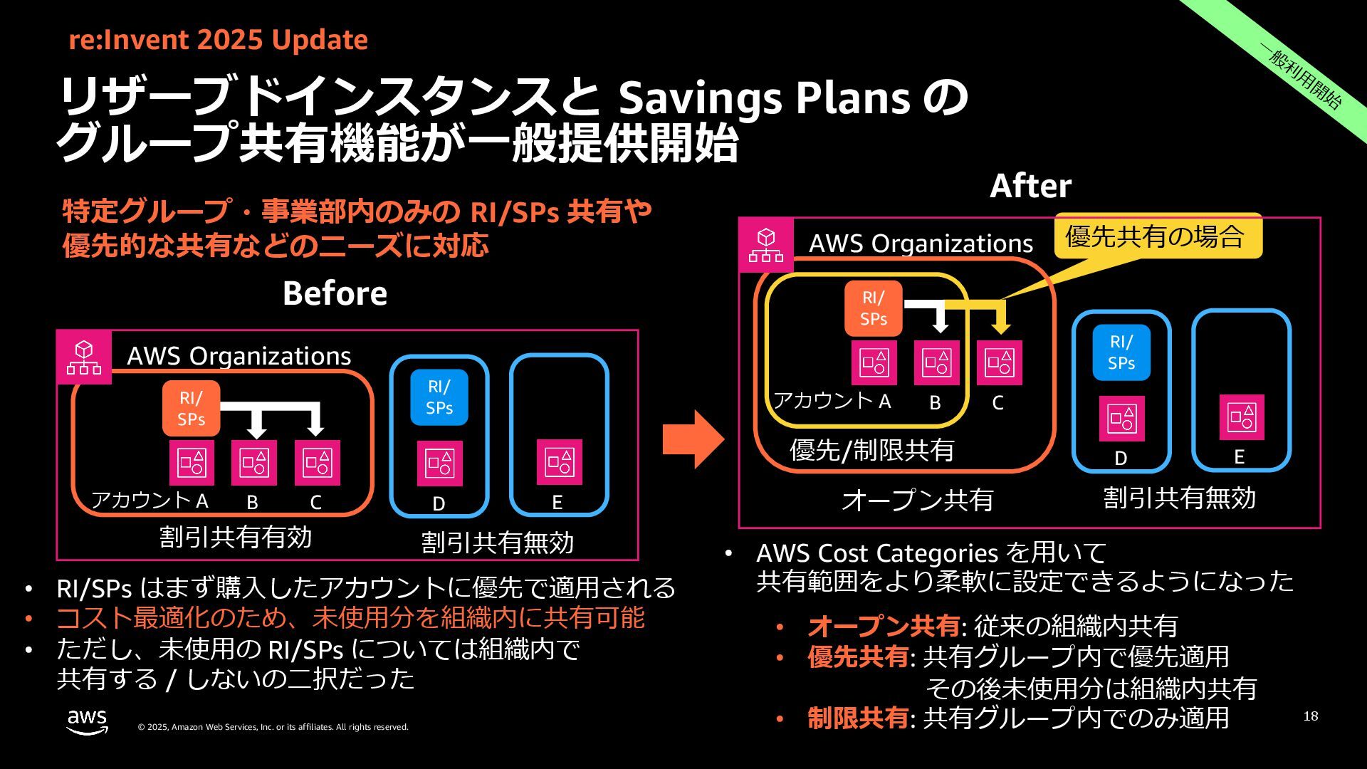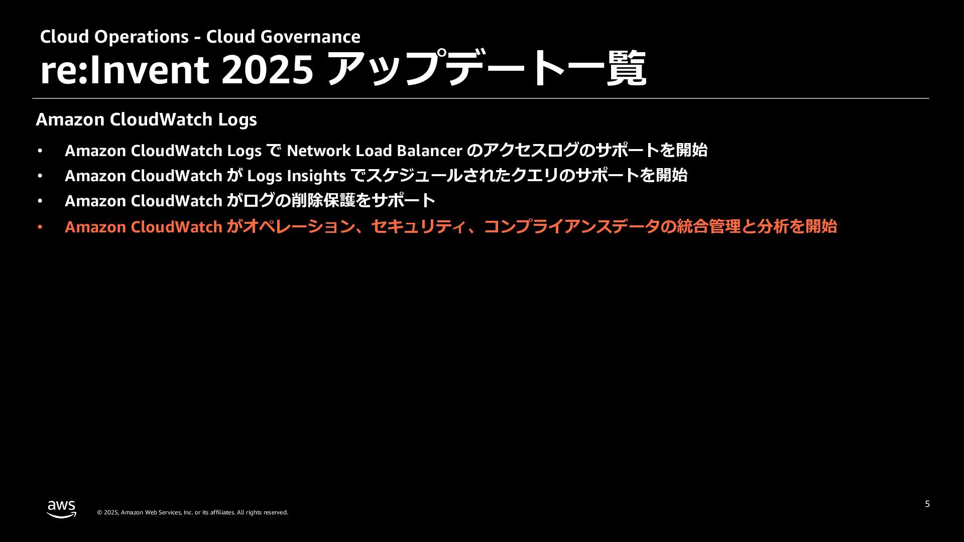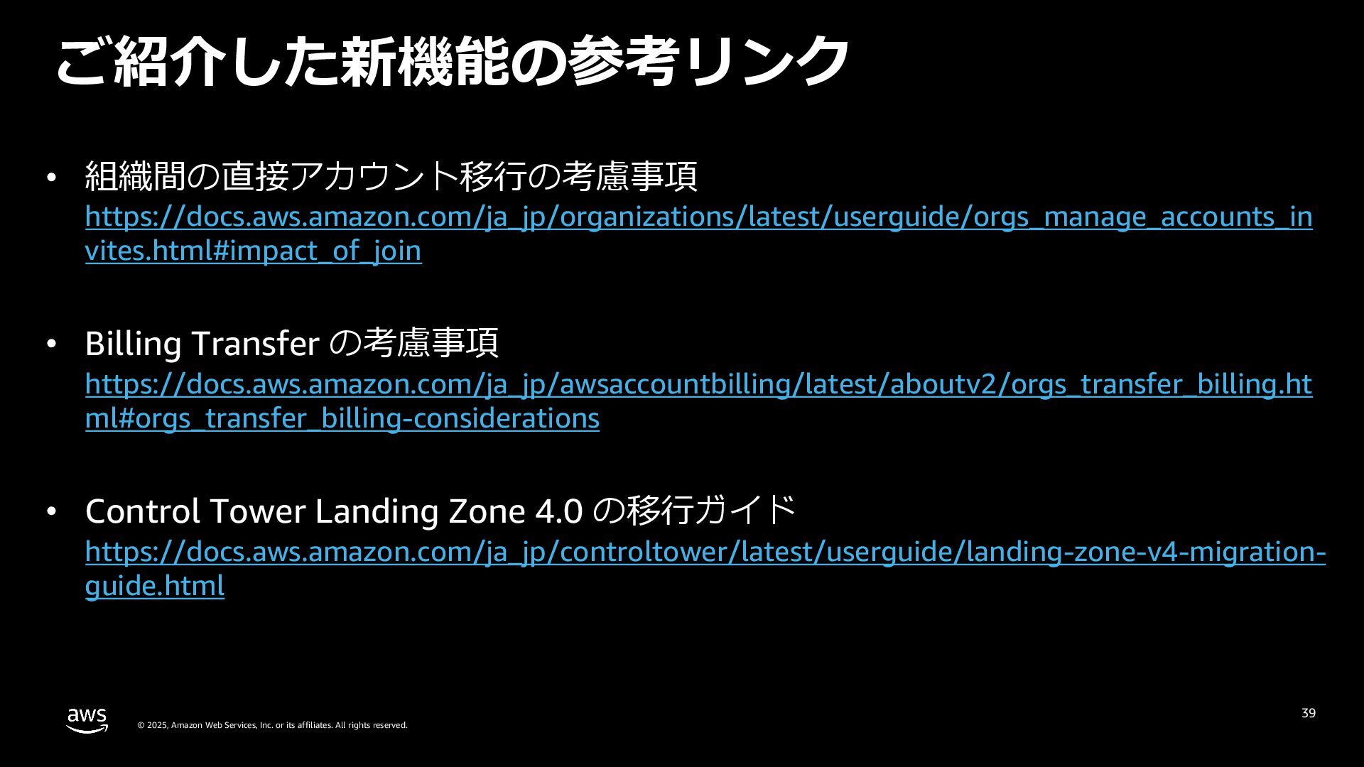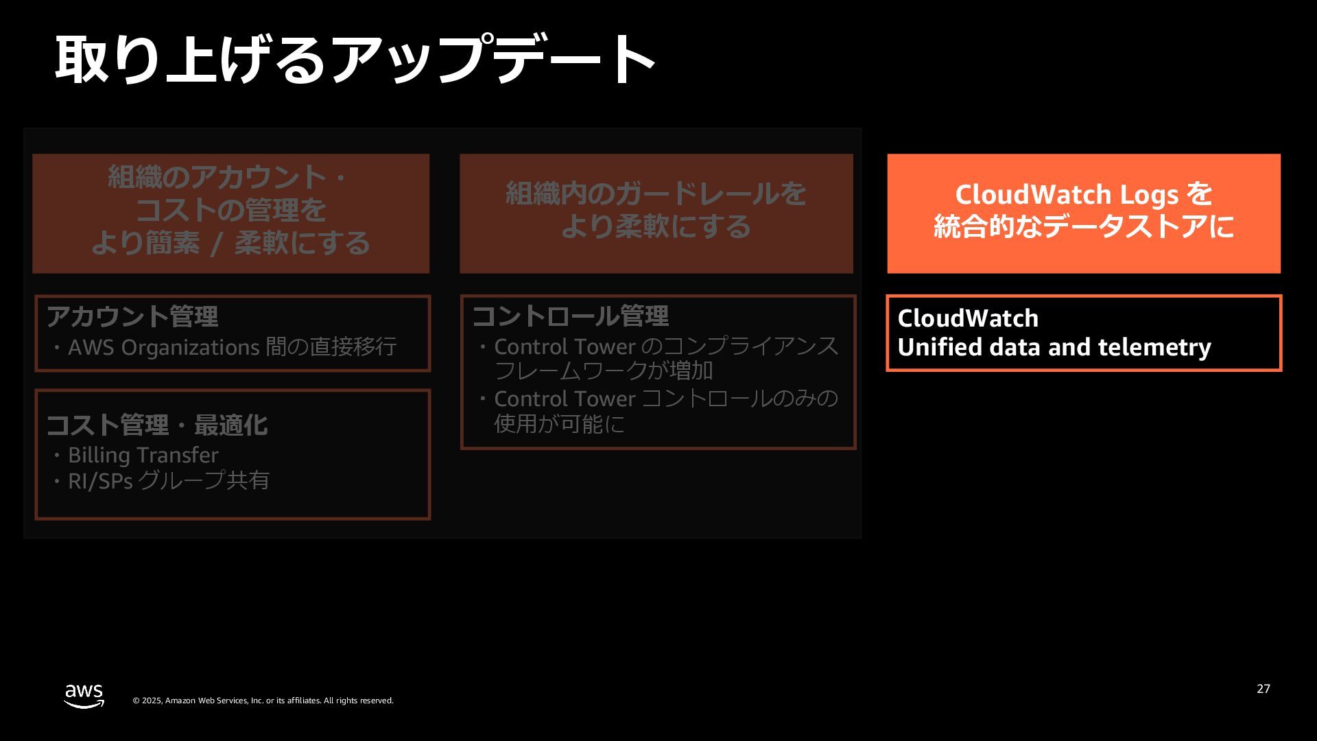 rights reserved. AWS Control Tower が 新しい コンプライアンスフレームワークのサポートを開始 24 ⼀ 般 利 ⽤ 開 始 フレームワーク AWS-WAF-v10 ACSC-Essential-Eight-Nov-2022 CIS-v8.0 ACSC-ISM-02-Mar-2023 PCI-DSS-v4.0 NIST-SP-800-171-r2 NIST-SP-800-53-r5 CCCS-Medium-Cloud-Control-May-2019 ISO-IEC-27001:2013-Annex-A NIST-CSF-v1.1 SSAE-18-SOC-2-Oct-2023 CIS-v7.1 PCI-DSS-v3.2.1 FedRAMP-r4 CIS-AWS-Benchmark-v1.3 CIS-AWS-Benchmark-v1.4 CIS-AWS-Benchmark-v1.2z NEW NEW NEW NEW NEW NEW NEW (NEW 2025/6) (NEW 2025/6) (NEW 2025/6) (NEW 2025/6) (NEW 2025/6) (NEW 2025/6) (NEW 2025/6) 2025 年で対応フレームワークが3→17に強化 re:Invent 2025 Update