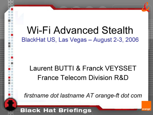 – Working for France Telecom - Orange (major telco) • Speakers at security-focused conferences – ShmooCon, ToorCon, FIRST, Eurosec… • Wi-Fi security focused speakers ;-) • “Wi-Fi Security: What’s Next” – ToorCon 2003 • “Design and Implementation of a Wireless IDS” – ToorCon 2004 and ShmooCon 2005 • “Wi-Fi Trickery, or How To Secure (?), Break (??) and Have Fun With Wi-Fi” – ShmooCon 2006