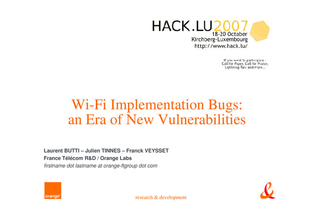 Group 802.11 Fuzzing? (1/2) 802.11 legacy standard is somewhat complex Several frame types (management, data, control) Lot of signalling • Rates, channel, network name, cryptographic capabilities, proprietary capabilities… All this stuff must be parsed by the firmware/driver! 802.11 extensions are more and more complex! 802.11i for security, 802.11e for QoS… 802.11w, 802.11r, 802.11k… Complexity++ Code++ Bugs++