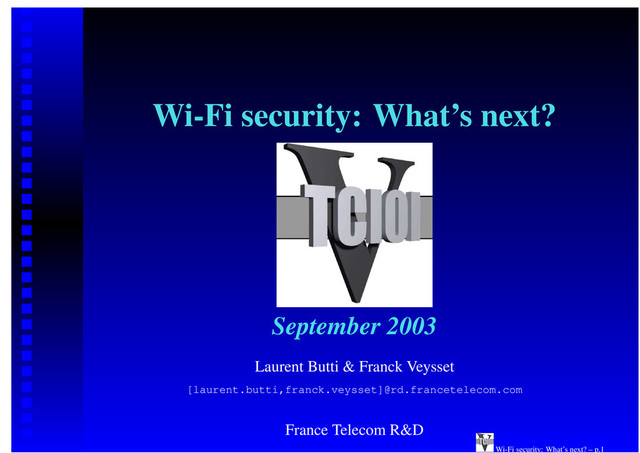 PMK Derive ANonce Derive SNonce EAPoL-Key(Unicast, SNonce, MIC, STA SSN IE) EAPoL-Key(Reply Required, Install PTK, Unicast, ANonce , MIC, AP SSN IE) Derive PTK Derive PTK EAPoL -Key(Unicast, ANonce, MIC) Install Keys Install Keys 802.1X controlled port still blocked for client Source : IEEE Wi-Fi security: What’s next? – p.29