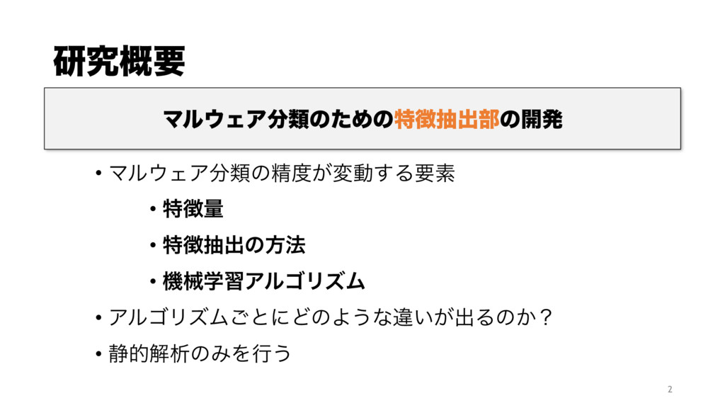 ΞϧΰϦζϜ͝ͱʹͲͷΑ͏ͳҧ͍͕ग़Δͷ͔ʁ • ੩తղੳͷΈΛߦ͏ 2 ϚϧΣΞྨͷͨΊͷಛநग़෦ͷ։ൃ