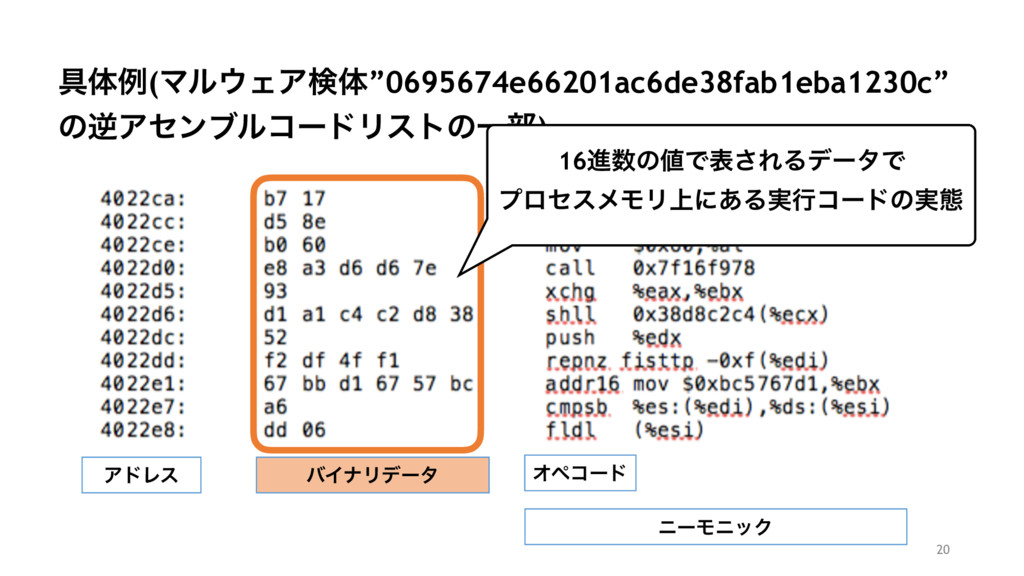 ۩ମྫ(ϚϧΣΞݕମ”0695674e66201ac6de38fab1eba1230c” ͷٯΞηϯϒϧίʔυϦετͷҰ෦) 20 ΞυϨε όΠφϦσʔλ Φϖίʔυ χʔϞχοΫ 16ਐͷͰද͞ΕΔσʔλͰ ϓϩηεϝϞϦ্ʹ͋Δ࣮ߦίʔυͷ࣮ଶ