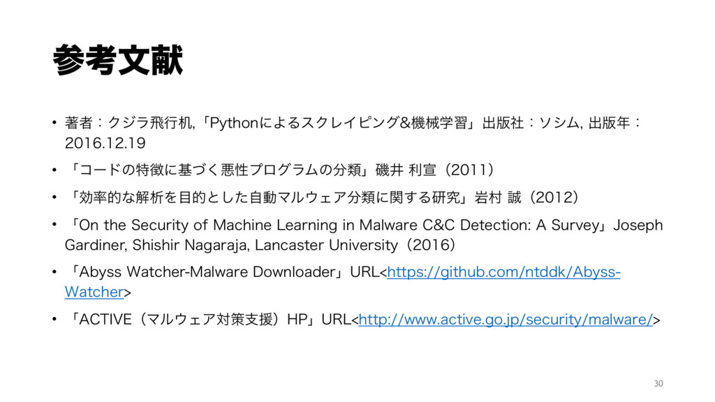 ࢀߟจݙ • ஶऀɿΫδϥඈߦص ʮ1ZUIPOʹΑΔεΫϨΠϐϯάػցֶशʯग़൛ࣾɿιγϜ ग़൛ɿ • ʮίʔυͷಛʹجͮ͘ѱੑϓϩάϥϜͷྨʯүҪརએʢʣ • ʮޮతͳղੳΛతͱͨࣗ͠ಈϚϧΣΞྨʹؔ͢Δݚڀʯؠଜʢʣ