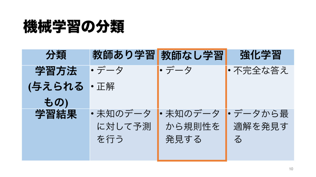 ػցֶशͷྨ 10 ྨ ڭࢣ͋Γֶश ڭࢣͳֶ͠श ڧԽֶश ֶशํ๏ (༩͑ΒΕΔ ͷ) •
