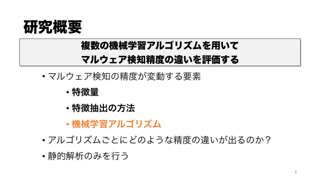 ΞϧΰϦζϜ͝ͱʹͲͷΑ͏ͳਫ਼ͷҧ͍͕ग़Δͷ͔ʁ • ੩తղੳͷΈΛߦ͏ 2 ෳͷػցֶशΞϧΰϦζϜΛ༻͍ͯ ϚϧΣΞݕਫ਼ͷҧ͍ΛධՁ͢Δ