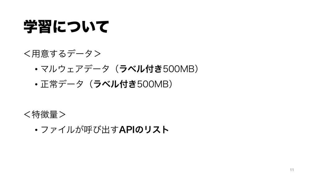 ֶशʹ͍ͭͯ 11 ʻ༻ҙ͢Δσʔλʼ • ϚϧΣΞσʔλʢϥϕϧ͖.#ʣ • ਖ਼ৗσʔλʢϥϕϧ͖.#ʣ ʻಛྔʼ • ϑΝΠϧ͕ݺͼग़͢"1*ͷϦετ