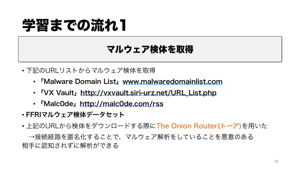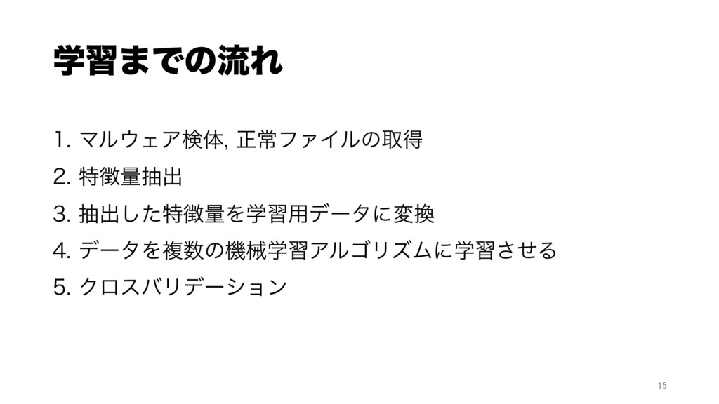 ֶश·ͰͷྲྀΕ 15 ϚϧΣΞݕମ ਖ਼ৗϑΝΠϧͷऔಘ ಛྔநग़ நग़ͨ͠ಛྔΛֶश༻σʔλʹม σʔλΛෳͷػցֶशΞϧΰϦζϜʹֶशͤ͞Δ ΫϩεόϦσʔγϣϯ