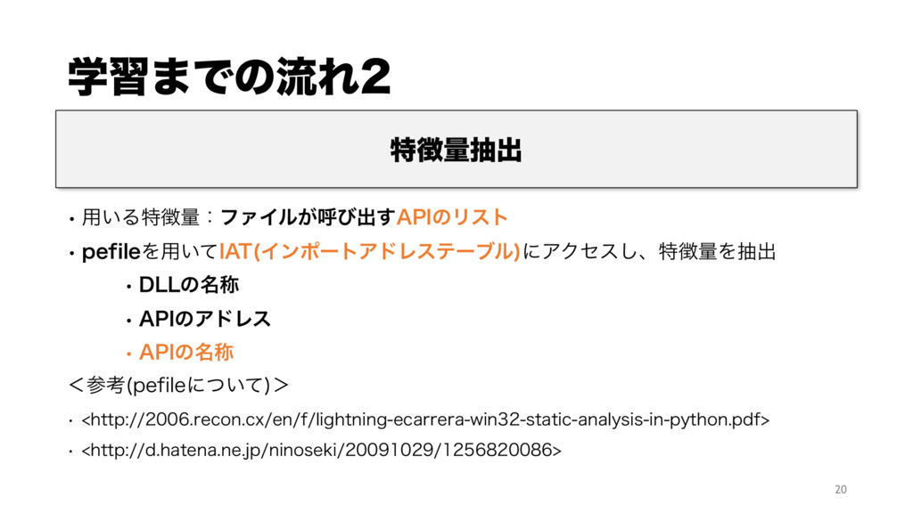 ֶश·ͰͷྲྀΕ 20 ಛྔநग़ w ༻͍ΔಛྔɿϑΝΠϧ͕ݺͼग़͢"1*ͷϦετ w QFGJMFΛ༻͍ͯ*"5 ΠϯϙʔτΞυϨεςʔϒϧ ʹΞΫηε͠ɺಛྔΛநग़ w