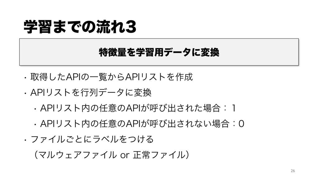 ֶश·ͰͷྲྀΕ 26 ಛྔΛֶश༻σʔλʹม w औಘͨ͠"1*ͷҰཡ͔Β"1*ϦετΛ࡞ w "1*ϦετΛߦྻσʔλʹม w "1*Ϧετͷҙͷ"1*͕ݺͼग़͞Εͨ߹ɿ̍ w