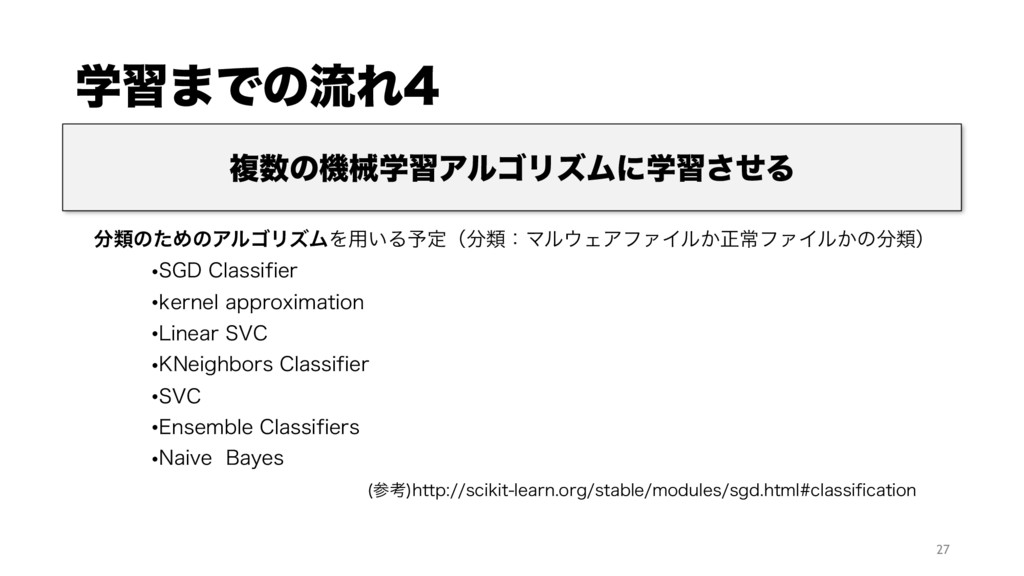 ֶश·ͰͷྲྀΕ ྨͷͨΊͷΞϧΰϦζϜΛ༻͍Δ༧ఆʢྨɿϚϧΣΞϑΝΠϧ͔ਖ਼ৗϑΝΠϧ͔ͷྨʣ •4(%$MBTTJGJFS •LFSOFMBQQSPYJNBUJPO •-JOFBS47$ •,/FJHICPST$MBTTJGJFS •47$ •&OTFNCMF$MBTTJGJFST •/BJWF#BZFT