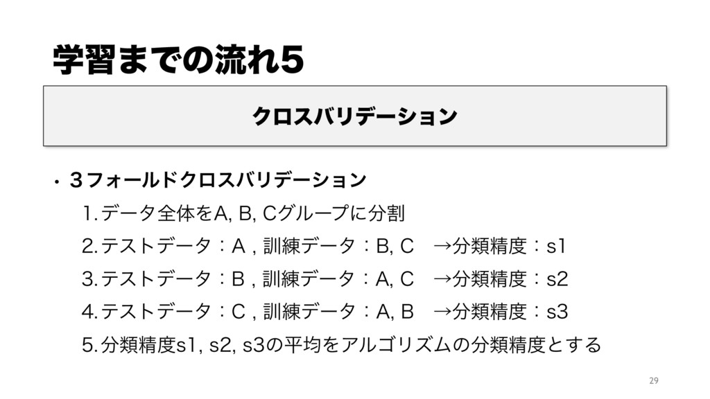 ֶश·ͰͷྲྀΕ 29 ΫϩεόϦσʔγϣϯ w ̏ϑΥʔϧυΫϩεόϦσʔγϣϯ σʔλશମΛ" # $άϧʔϓʹׂ ςετσʔλɿ" ܇࿅σʔλɿ#