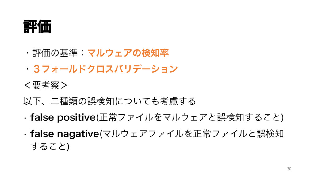 ධՁ 30 ɾධՁͷج४ɿϚϧΣΞͷݕ ɾ̏ϑΥʔϧυΫϩεόϦσʔγϣϯ ʻཁߟʼ ҎԼɺೋछྨͷޡݕʹ͍ͭͯߟྀ͢Δ w GBMTFQPTJUJWF ਖ਼ৗϑΝΠϧΛϚϧΣΞͱޡݕ͢Δ͜ͱ