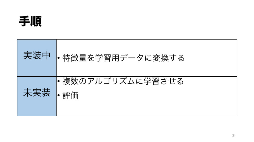 खॱ 31 ࣮த • ಛྔΛֶश༻σʔλʹม͢Δ ະ࣮ • ෳͷΞϧΰϦζϜʹֶशͤ͞Δ • ධՁ