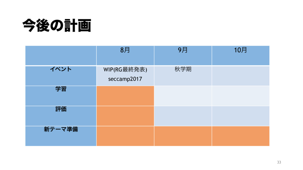 ࠓޙͷܭը 33 8݄ 9݄ 10݄ Πϕϯτ WIP(RG࠷ऴൃද) seccamp2017 ळֶظ ֶश