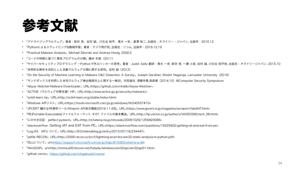 ʮ1SBDUJDBM.BMXBSF"OBMZTJTʯ.JDIBFM4JLPSTLJBOE"OESFX)POJH • ʮίʔυͷಛʹجͮ͘ѱੑϓϩάϥϜͷྨʯүҪརએʢʣ • ʮαΠόʔηΩϡϦςΟϓϩάϥϛϯάʕ1ZUIPOͰֶͿϋοΧʔͷࢥߟʯஶऀɿ+VTUJO4FJU[༁ɿ੨Ұ࢙ ৽Ҫ༔ Ұখ ؠଜ ݹ୩༟ฏଞ ग़൛ࣾɿΦϥΠϦʔδϟύϯ • ʮޮతͳղੳΛతͱͨࣗ͠ಈϚϧΣΞྨʹؔ͢Δݚڀʯؠଜʢʣ • ʮ0OUIF4FDVSJUZPG.BDIJOF-FBSOJOHJO.BMXBSF$$%FUFDUJPO"4VSWFZʯ+PTFQI(BSEJOFS 4IJTIJS/BHBSBKB -BODBTUFS6OJWFSTJUZʢʣ • ʮαϯυϘοΫεΛར༻ͨ͠ະϚϧΣΞݕग़ਫ਼্ʹؔ͢ΔҰݕ౼ʯࢢాୡ ਢ౻ষ ߴ֮ʢʣ!$PNQVUFS4FDVSJUZ4ZNQPTJVN • ʮ"CZTT8BUDIFS.BMXBSF%PXOMPBEFSʯ63-IUUQTHJUIVCDPNOUEEL"CZTT8BUDIFS • ʮ"$5*7&ʢϚϧΣΞରࡦࢧԉʣ)1ʯ63-IUUQXXXBDUJWFHPKQTFDVSJUZNBMXBSF • ʮTDJLJUMFBSOIQʯ63-IUUQTDJLJUMFBSOPSHTUBCMFJOEFYIUNM • ʮ8JOEPXT"1*Ϧετʯ63-IUUQTNTEONJDSPTPGUDPNKBKQXJOEPXTII • ʮ+1$&35᱐ͤΔ1&ղੳπʔϧͷ*NQPSU"1*දࣔػೳ ʯ63-IUUQTXXXKQDFSUPSKQNBHB[JOFBDSFQPSUGBLF*/5IUNM • ʮ1& 1PSUBCMF&YFDVUBCMF ϑΝΠϧϑΥʔϚοτͦͷϑΝΠϧͷجຊߏʯ63-IUUQIQWFDUPSDPKQBVUIPST7"UFDI@IUNM • ʮʹͷ͖ͤهɹQFGJMFͱQZEBTNʯ63-IUUQEIBUFOBOFKQOJOPTFLJ • ʮTUBDLPWFSGMPX(FUUJOH*"5BOE&"5GSPN1&ʯ63-IUUQTTUBDLPWFSGMPXDPNRVFTUJPOTHFUUJOHJBUBOEFBUGSPNQF • ʮ-PHJɹ*"5ʹ͍ͭͯʯ63-IUUQJIBUFOBCMPHKQFOUSZ • ʮQFGJMF3&$0/ʯ63-IUUQSFDPODYFOGMJHIUOJOHFDBSSFSBXJOTUBUJDBOBMZTJTJOQZUIPOQEG • ʮ%--ʹ͍ͭͯʯVSMIUUQTTVQQPSUNJDSPTPGUDPNKBKQIFMQXIBUJTBEMM • ʮ8JO"1*ʯVSMIUUQIPNFBJUTDPNOFUIBUBEBXJOEPXTXJOBQJXJOBQJIUNM • ʮHJUIVCWFDUPSʯIUUQTHJUIVCDPNDIJHBLVJTIJWFDUPS 34