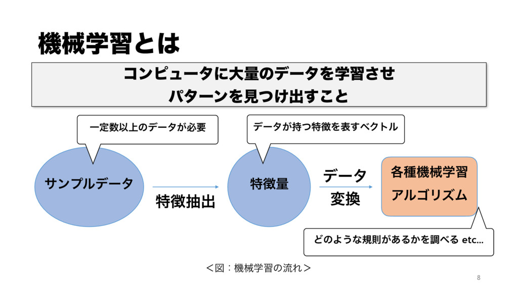 ػցֶशͱ 8 ίϯϐϡʔλʹେྔͷσʔλΛֶशͤ͞ ύλʔϯΛݟ͚ͭग़͢͜ͱ αϯϓϧσʔλ ಛநग़ ಛྔ ֤छػցֶश ΞϧΰϦζϜ ʻਤɿػցֶशͷྲྀΕʼ