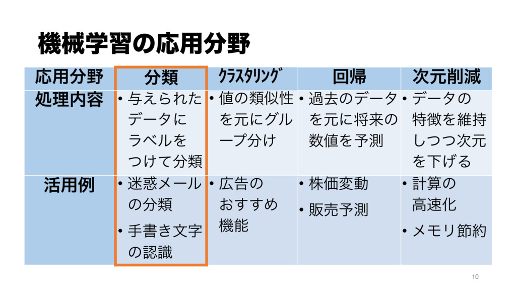 ػցֶशͷྨ 9 ྨ ڭࢣ͋Γֶश ڭࢣͳֶ͠श ڧԽֶश ֶशํ๏ (༩͑ΒΕΔ ͷ) •