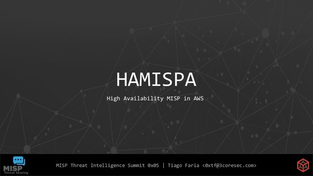 (think VMs) in AWS - Friendly GNU/Linux ecosystem - These instances will be our cluster nodes - Part of our Auto-Scaling Group (ASG) - Holds AWS SES configuration, PHP, Apache and MISP in AWS EFS mount point (/var/www/MISP) - Will be the source for the AMI that will be used on auto-scaling by other cluster nodes $ cat aws-ec2.txt