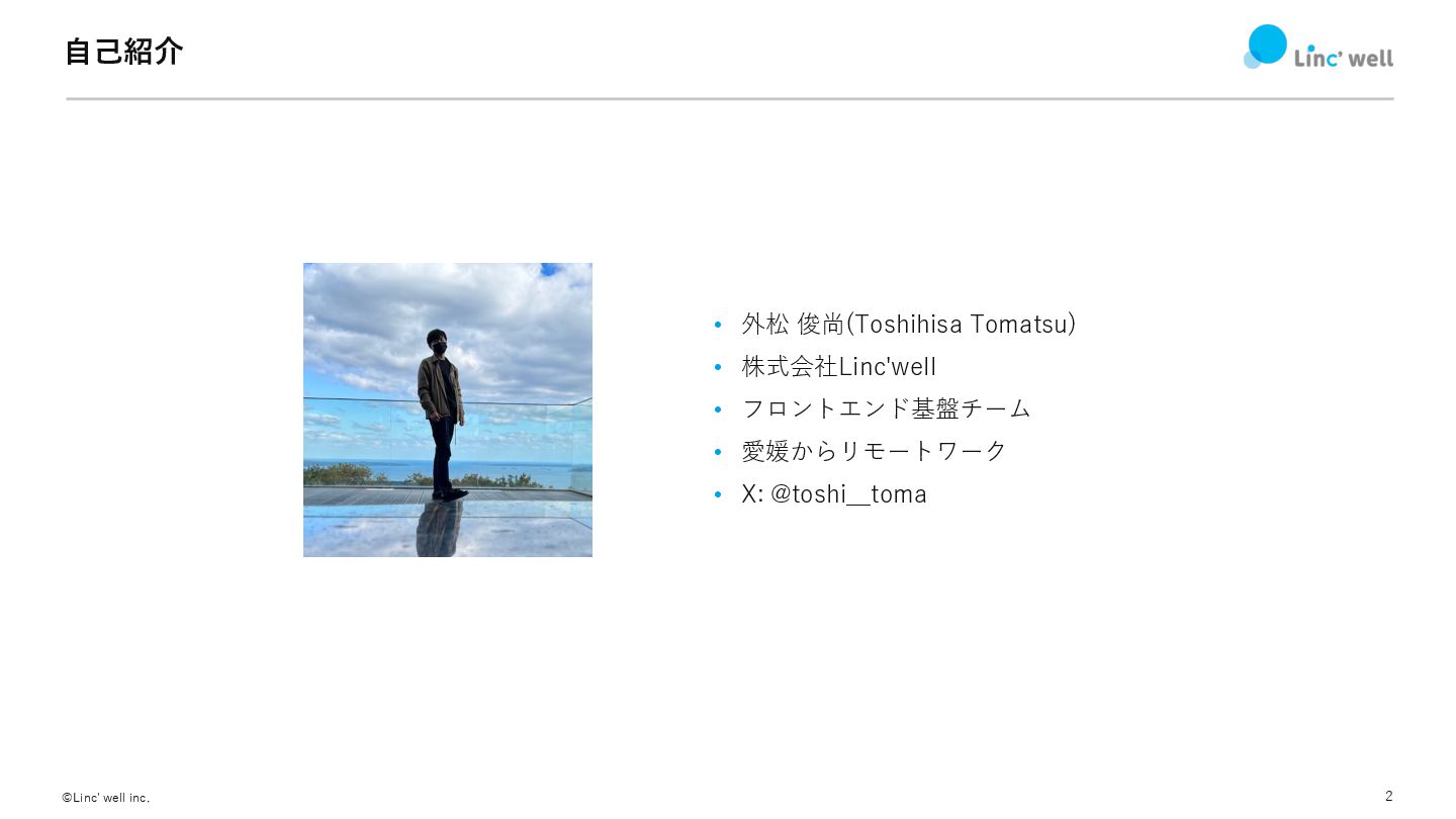 株式会社Linc'well • フロントエンド基盤チーム • 愛媛からリモートワーク • X: @toshi__toma