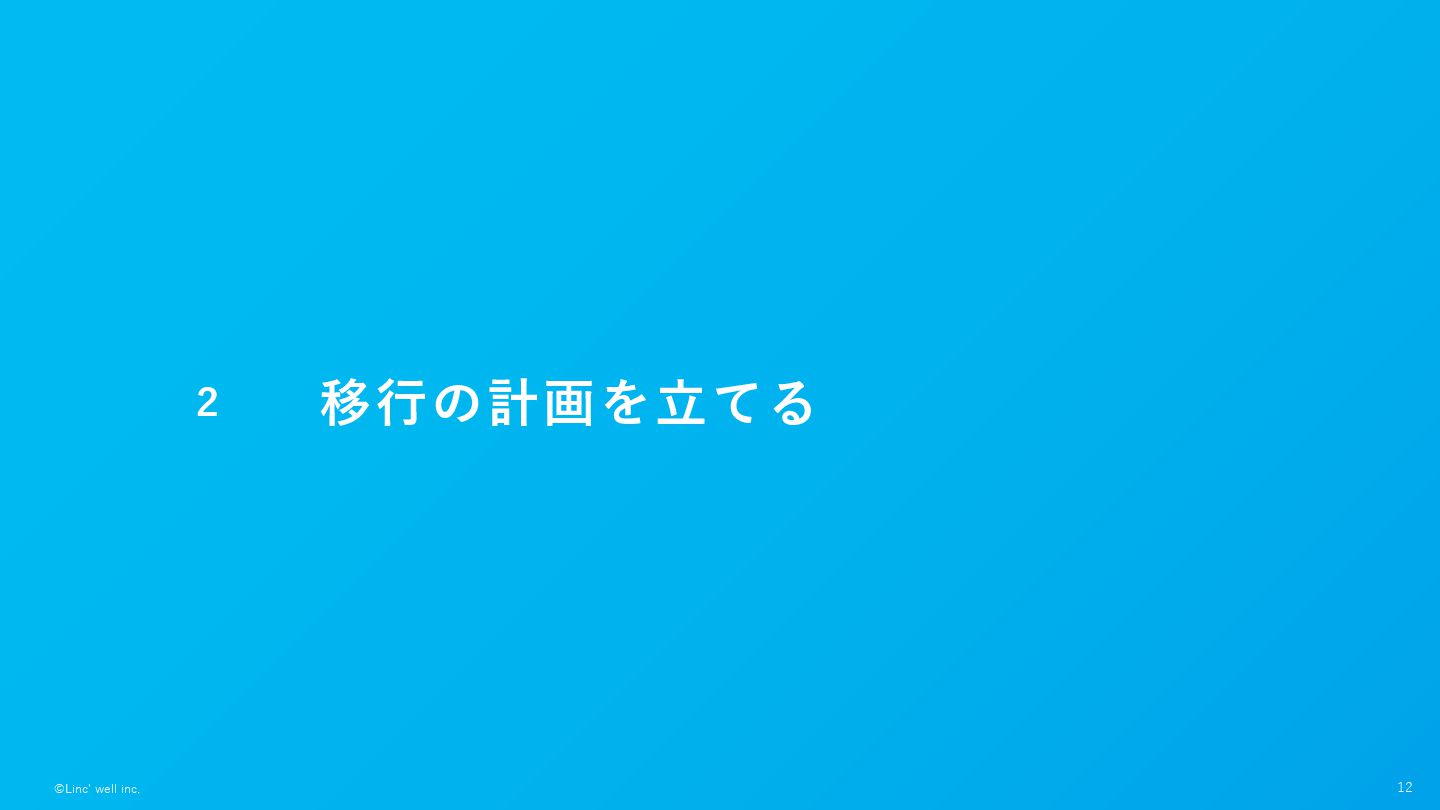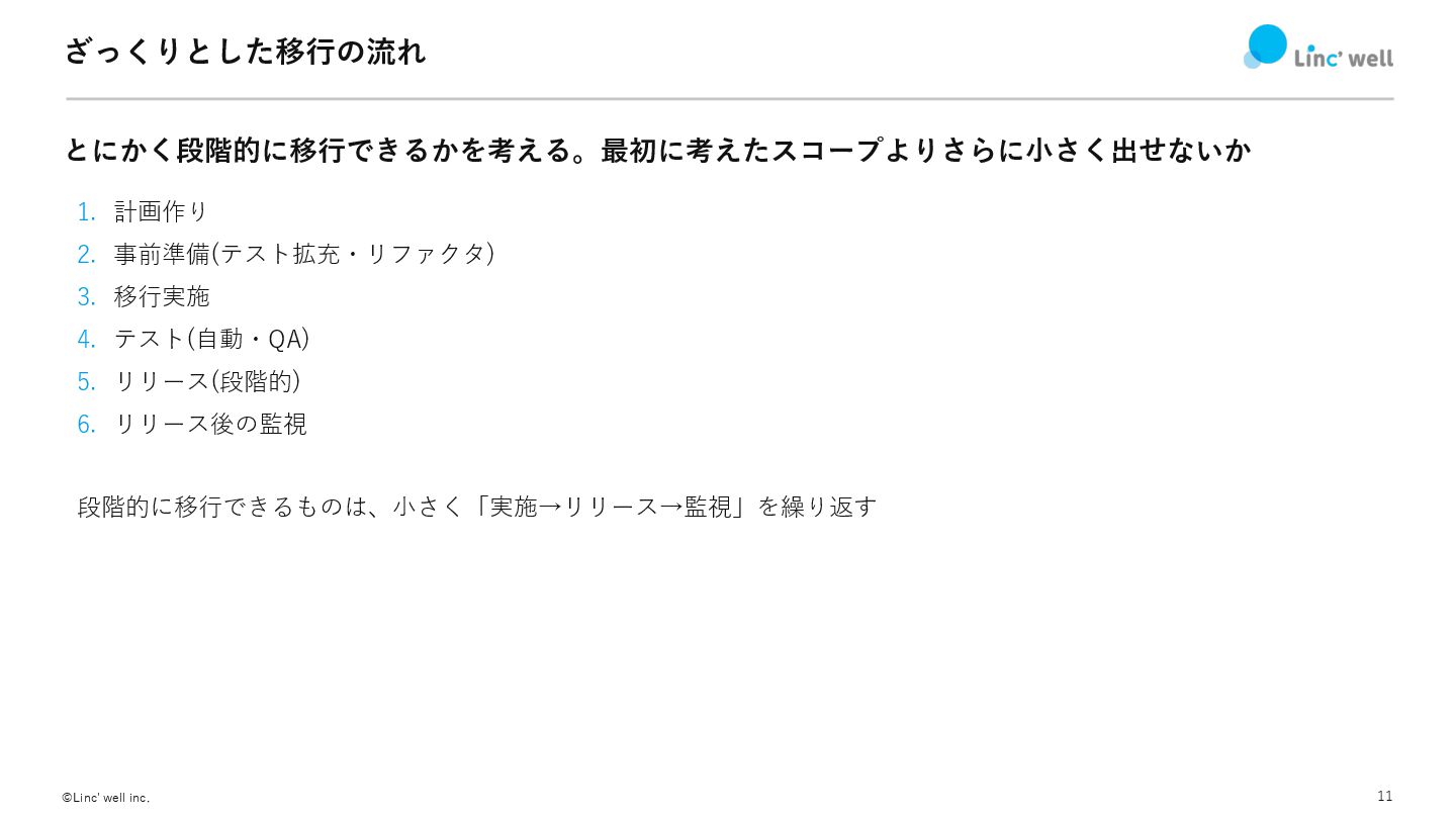 11 ©Linc' well inc. ざっくりとした移⾏の流れ とにかく段階的に移⾏できるかを考える。最初に考えたスコープよりさらに⼩さく出せないか 1. 計画作り 2. 事前準備(テスト拡充・リファクタ)