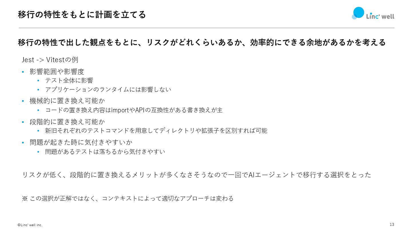 13 ©Linc' well inc. 移⾏の特性をもとに計画を⽴てる 移⾏の特性で出した観点をもとに、リスクがどれくらいあるか、効率的にできる余地があるかを考える Jest -> Vitestの例 •