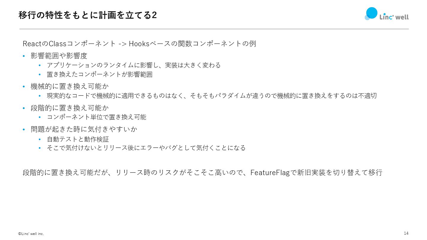 14 ©Linc' well inc. 移⾏の特性をもとに計画を⽴てる2 ReactのClassコンポーネント -> Hooksベースの関数コンポーネントの例 • 影響範囲や影響度