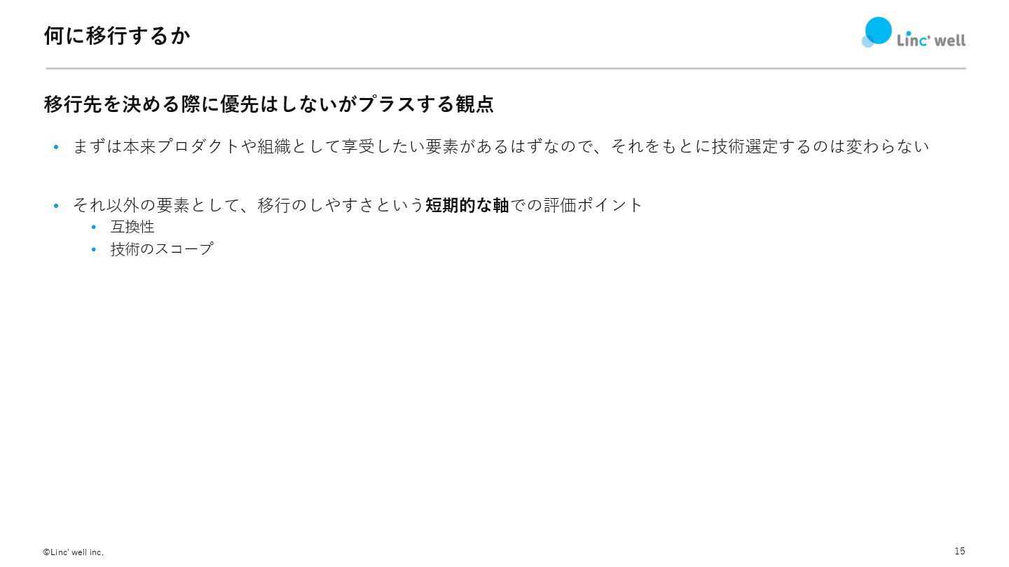 15 ©Linc' well inc. 何に移⾏するか 移⾏先を決める際に優先はしないがプラスする観点 • まずは本来プロダクトや組織として享受したい要素があるはずなので、それをもとに技術選定するのは変わらない • それ以外の要素として、移⾏のしやすさという短期的な軸での評価ポイント