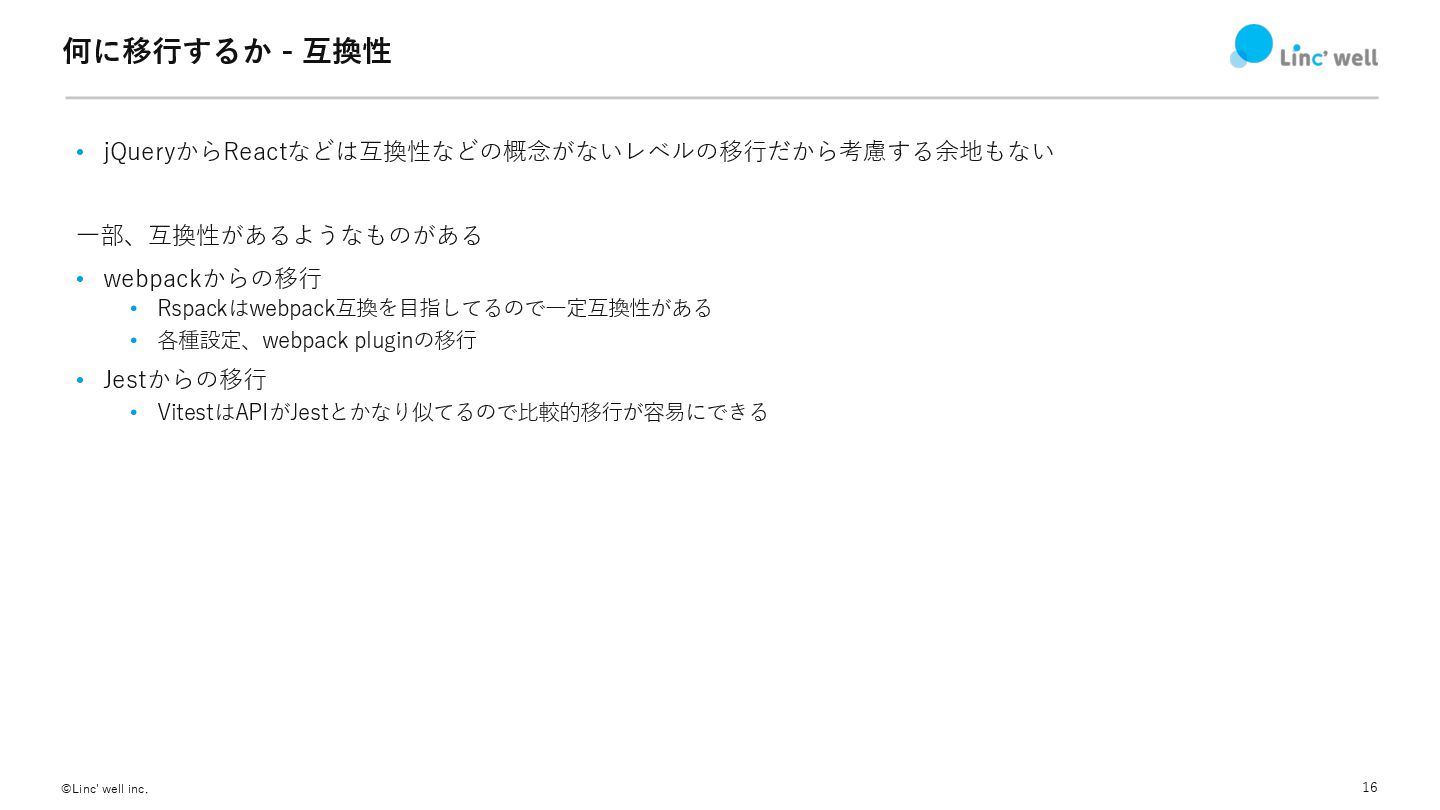 16 ©Linc' well inc. 何に移⾏するか - 互換性 • jQueryからReactなどは互換性などの概念がないレベルの移⾏だから考慮する余地もない ⼀部、互換性があるようなものがある