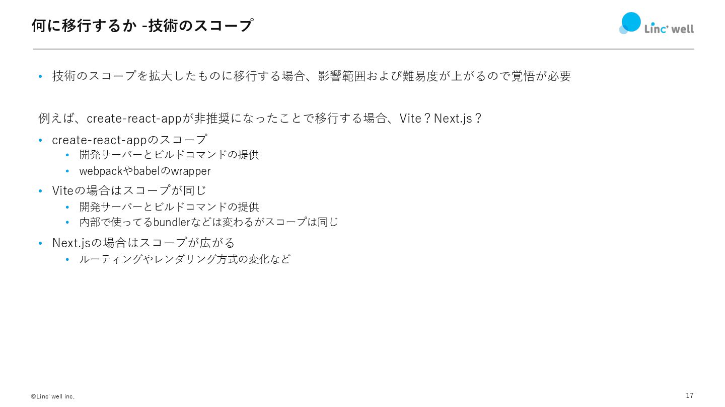 17 ©Linc' well inc. 何に移⾏するか -技術のスコープ • 技術のスコープを拡⼤したものに移⾏する場合、影響範囲および難易度が上がるので覚悟が必要 例えば、create-react-appが⾮推奨になったことで移⾏する場合、Vite?Next.js? •