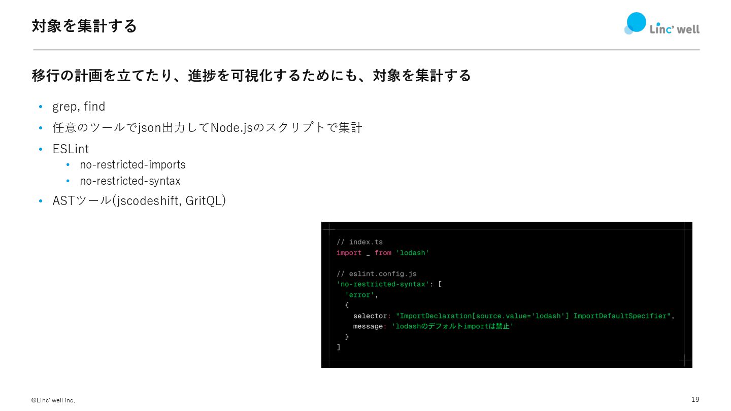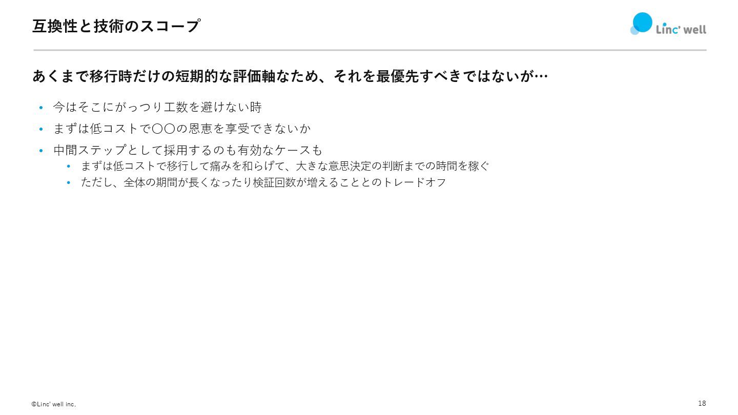 18 ©Linc' well inc. 互換性と技術のスコープ あくまで移⾏時だけの短期的な評価軸なため、それを最優先すべきではないが… • 今はそこにがっつり⼯数を避けない時 • まずは低コストで〇〇の恩恵を享受できないか
