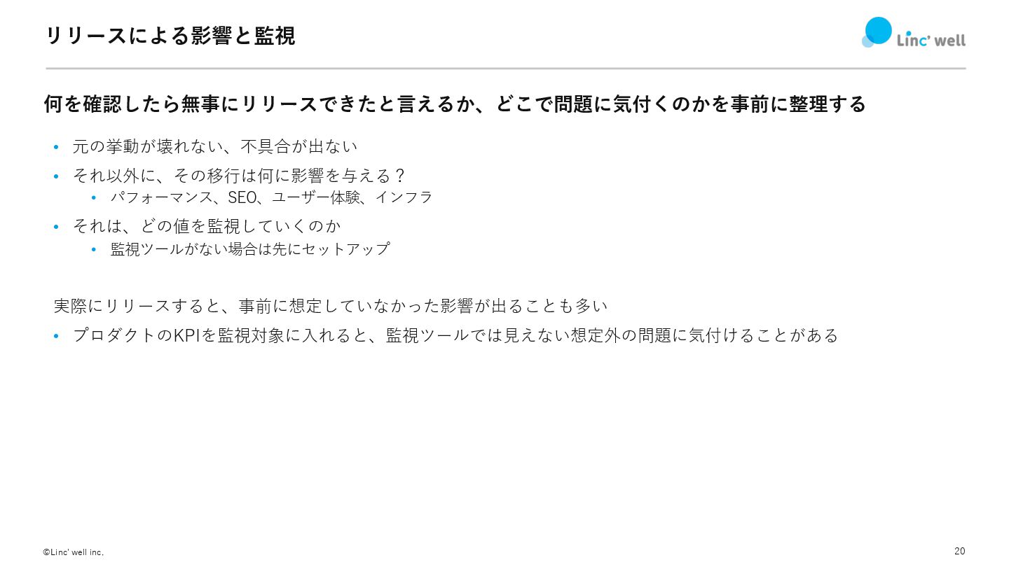 20 ©Linc' well inc. リリースによる影響と監視 何を確認したら無事にリリースできたと⾔えるか、どこで問題に気付くのかを事前に整理する • 元の挙動が壊れない、不具合が出ない • それ以外に、その移⾏は何に影響を与える?