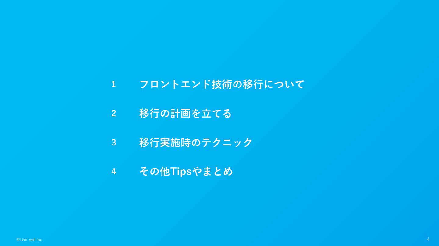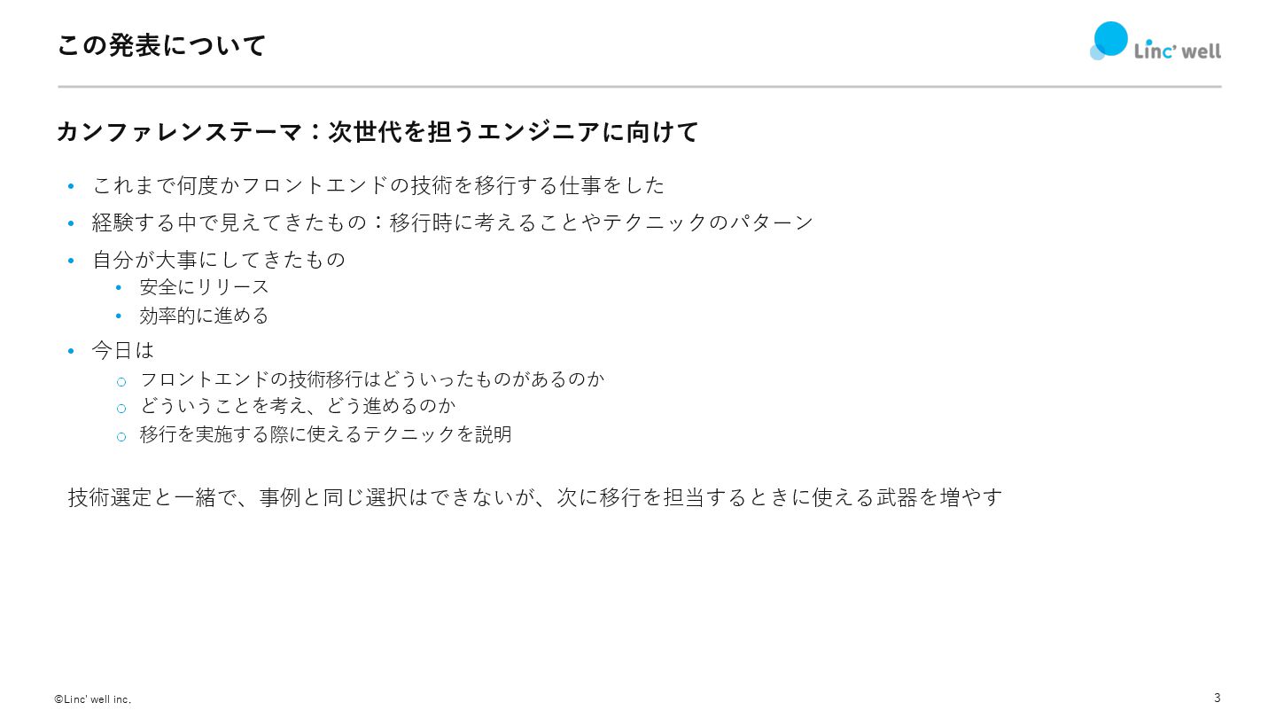 3 ©Linc' well inc. この発表について カンファレンステーマ:次世代を担うエンジニアに向けて • これまで何度かフロントエンドの技術を移⾏する仕事をした • 経験する中で⾒えてきたもの:移⾏時に考えることやテクニックのパターン
