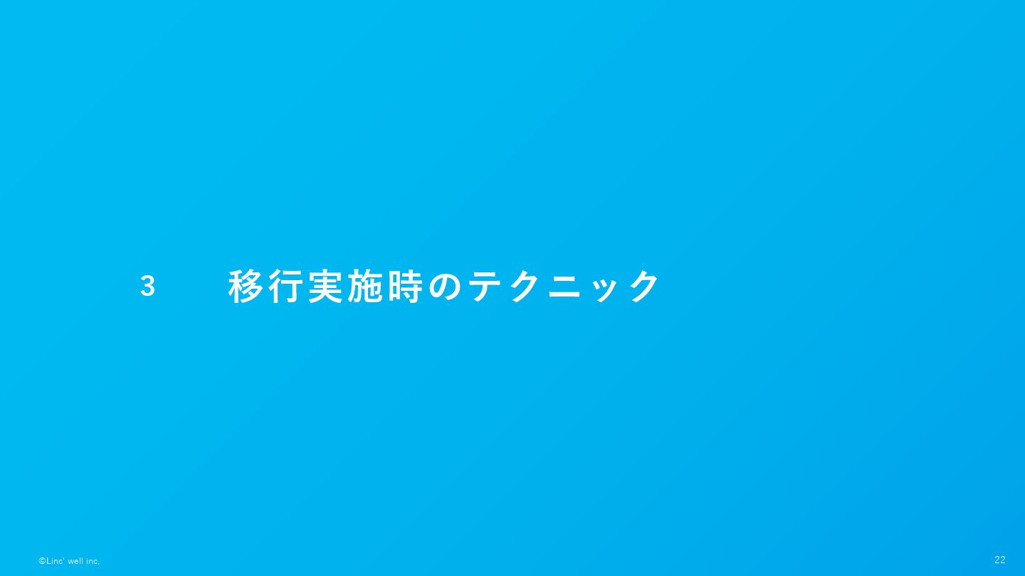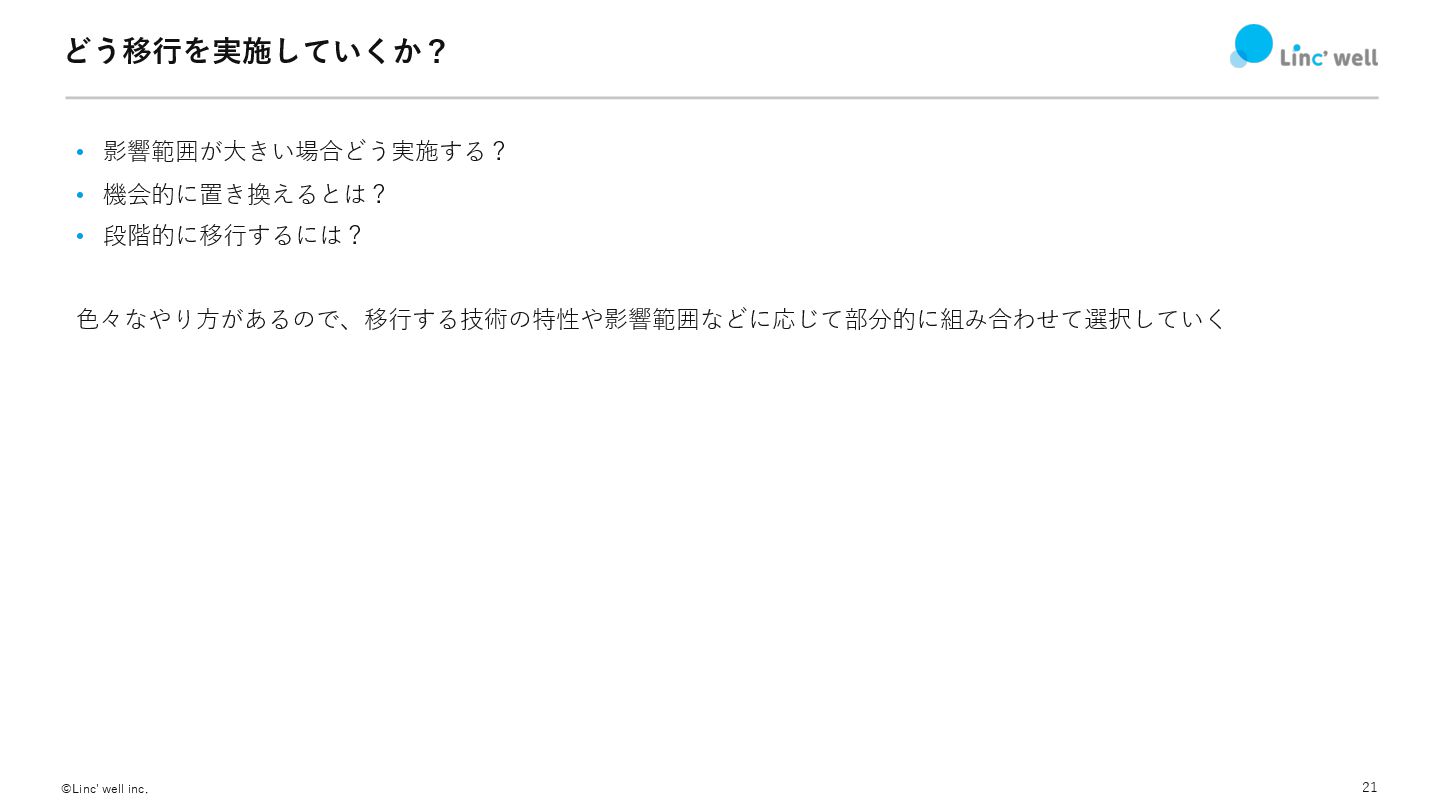 21 ©Linc' well inc. どう移⾏を実施していくか? • 影響範囲が⼤きい場合どう実施する? • 機会的に置き換えるとは? •