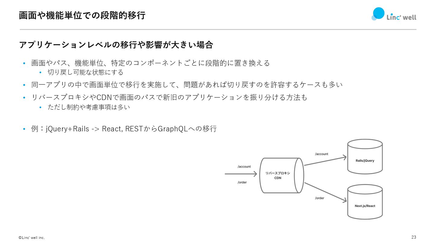 23 ©Linc' well inc. 画⾯や機能単位での段階的移⾏ アプリケーションレベルの移⾏や影響が⼤きい場合 • 画⾯やパス、機能単位、特定のコンポーネントごとに段階的に置き換える • 切り戻し可能な状態にする