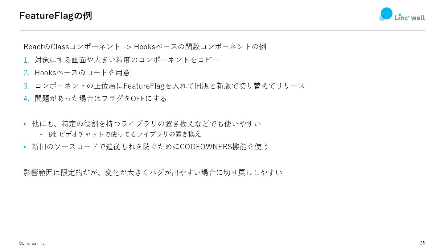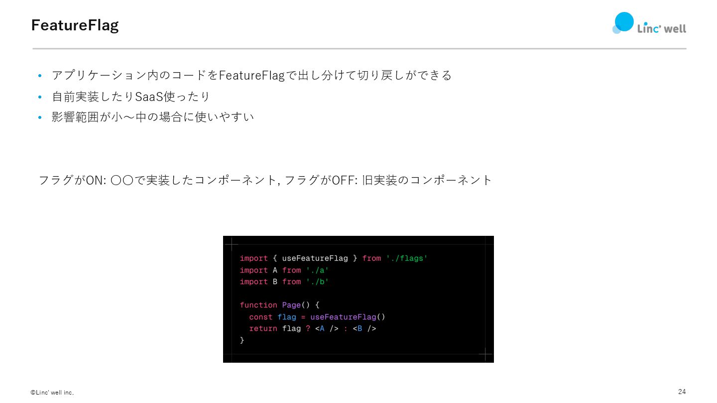 24 ©Linc' well inc. FeatureFlag • アプリケーション内のコードをFeatureFlagで出し分けて切り戻しができる • ⾃前実装したりSaaS使ったり •