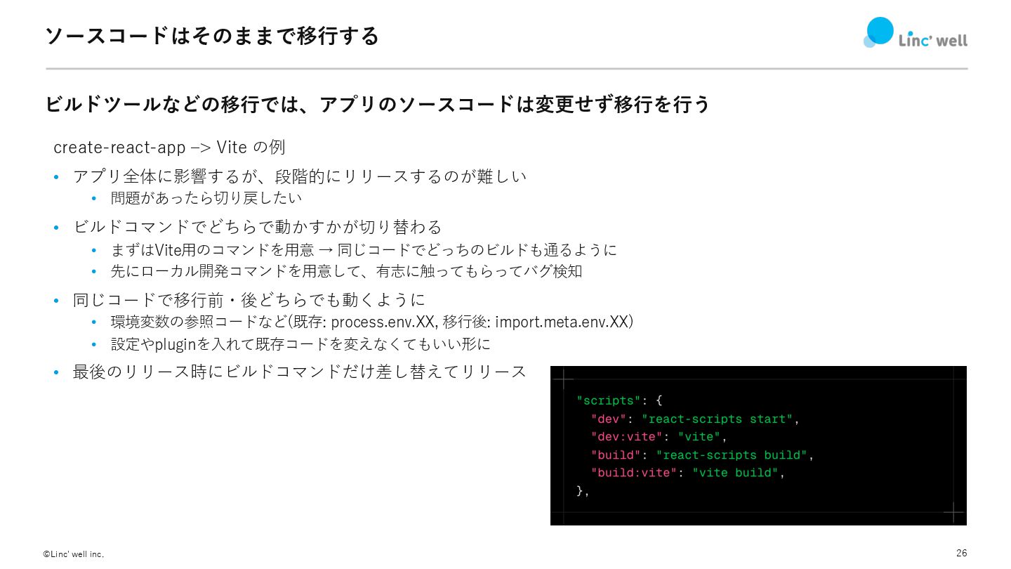 26 ©Linc' well inc. ソースコードはそのままで移⾏する ビルドツールなどの移⾏では、アプリのソースコードは変更せず移⾏を⾏う create-react-app ‒> Vite の例