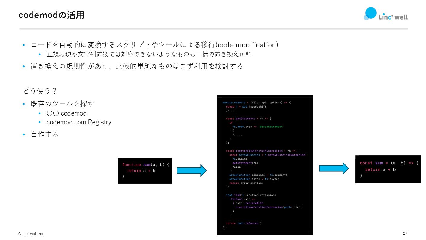 27 ©Linc' well inc. codemodの活⽤ • コードを⾃動的に変換するスクリプトやツールによる移⾏(code modification) • 正規表現や⽂字列置換では対応できないようなものも⼀括で置き換え可能