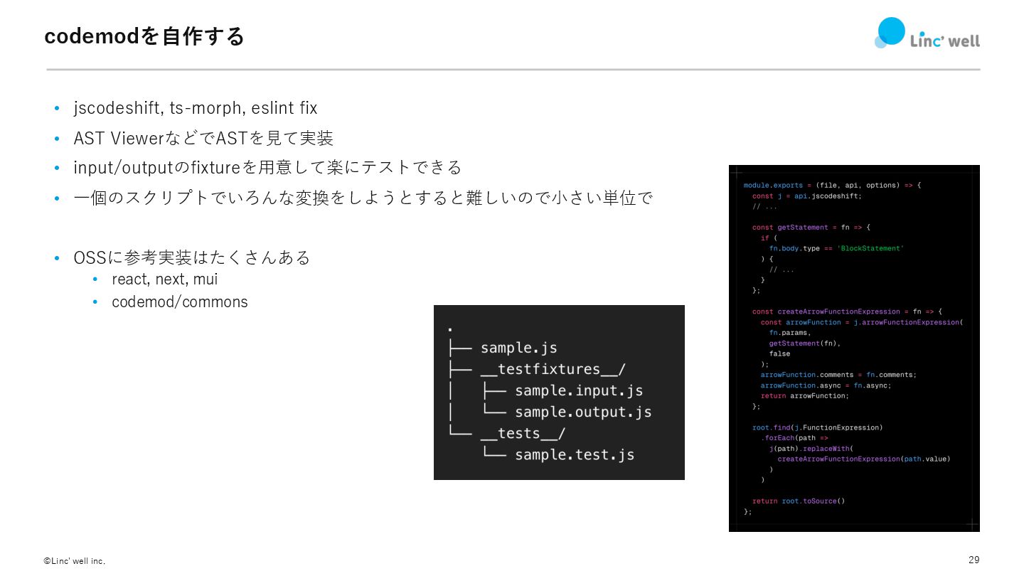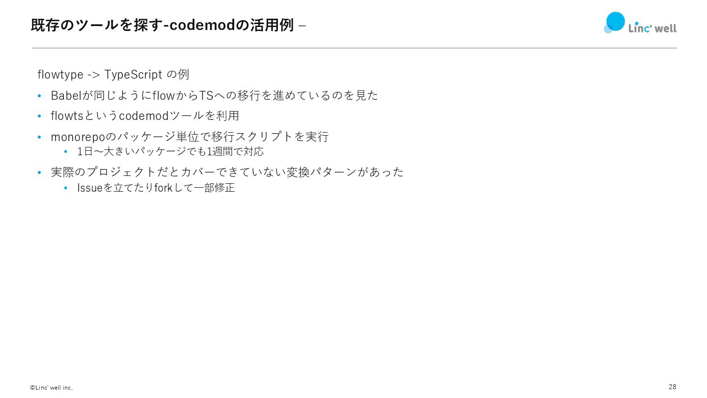 28 ©Linc' well inc. 既存のツールを探す-codemodの活⽤例 ‒ flowtype -> TypeScript の例
