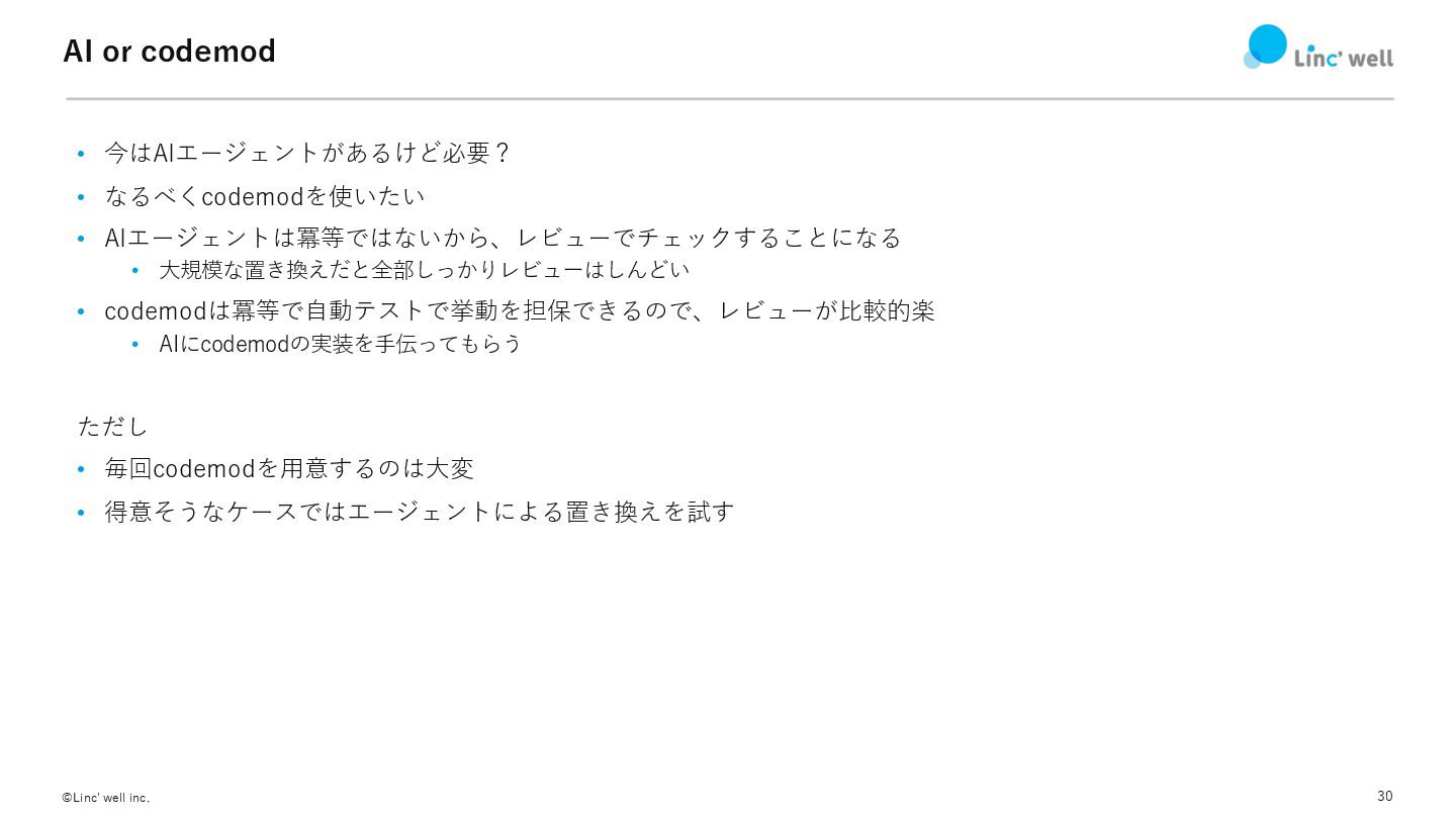 30 ©Linc' well inc. AI or codemod • 今はAIエージェントがあるけど必要? •