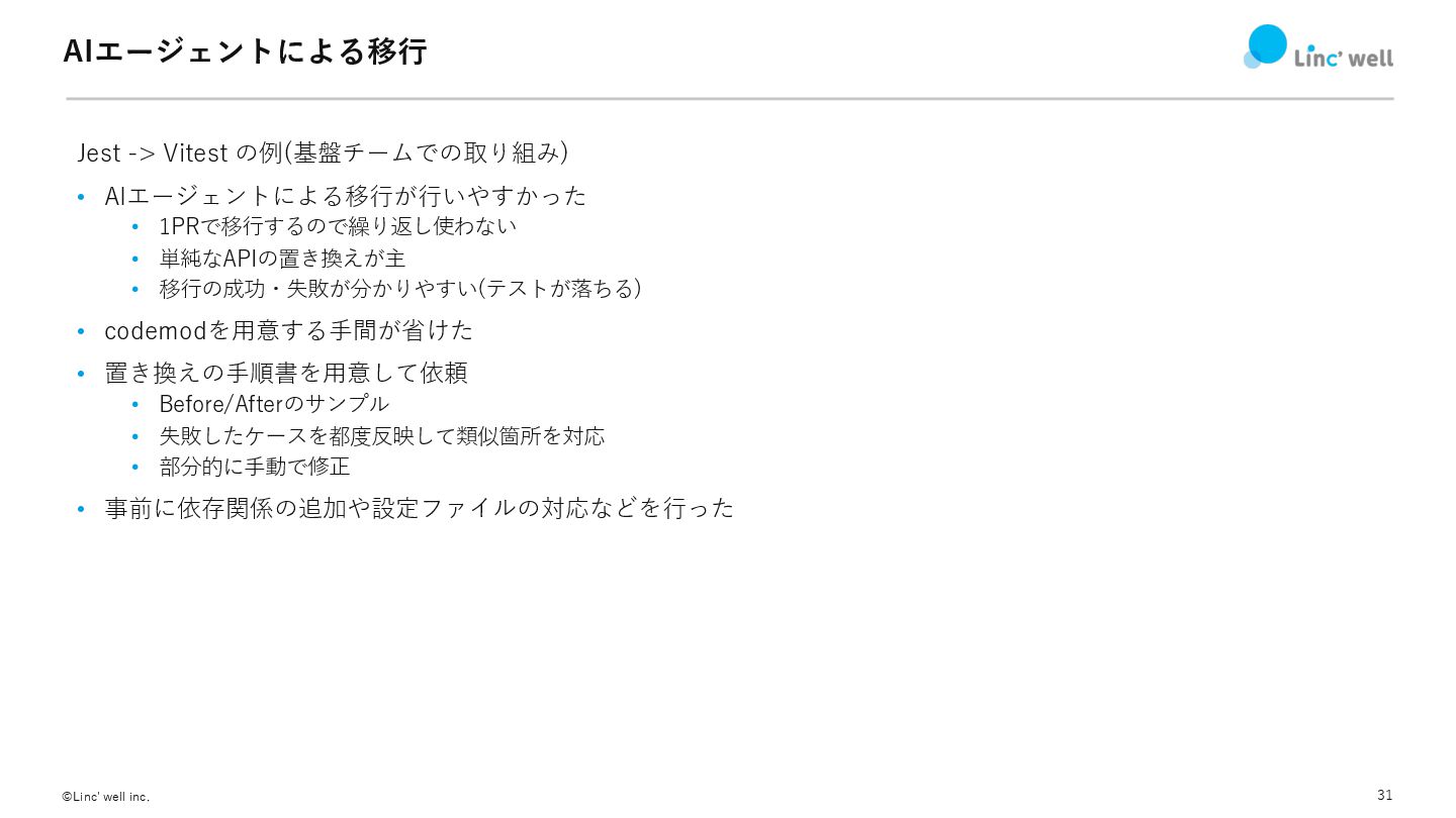 31 ©Linc' well inc. AIエージェントによる移⾏ Jest -> Vitest の例(基盤チームでの取り組み) •