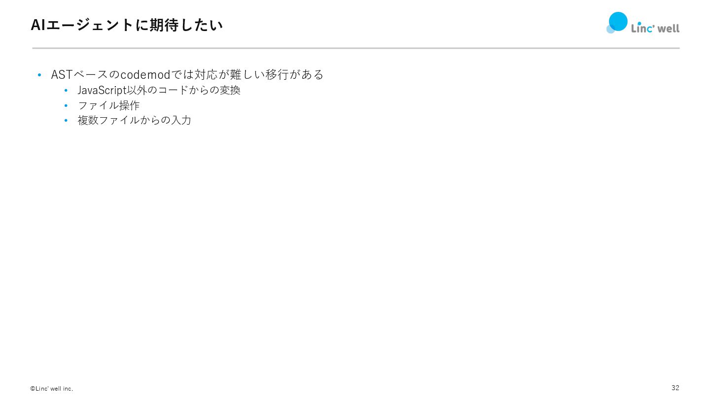 32 ©Linc' well inc. AIエージェントに期待したい • ASTベースのcodemodでは対応が難しい移⾏がある • JavaScript以外のコードからの変換 •